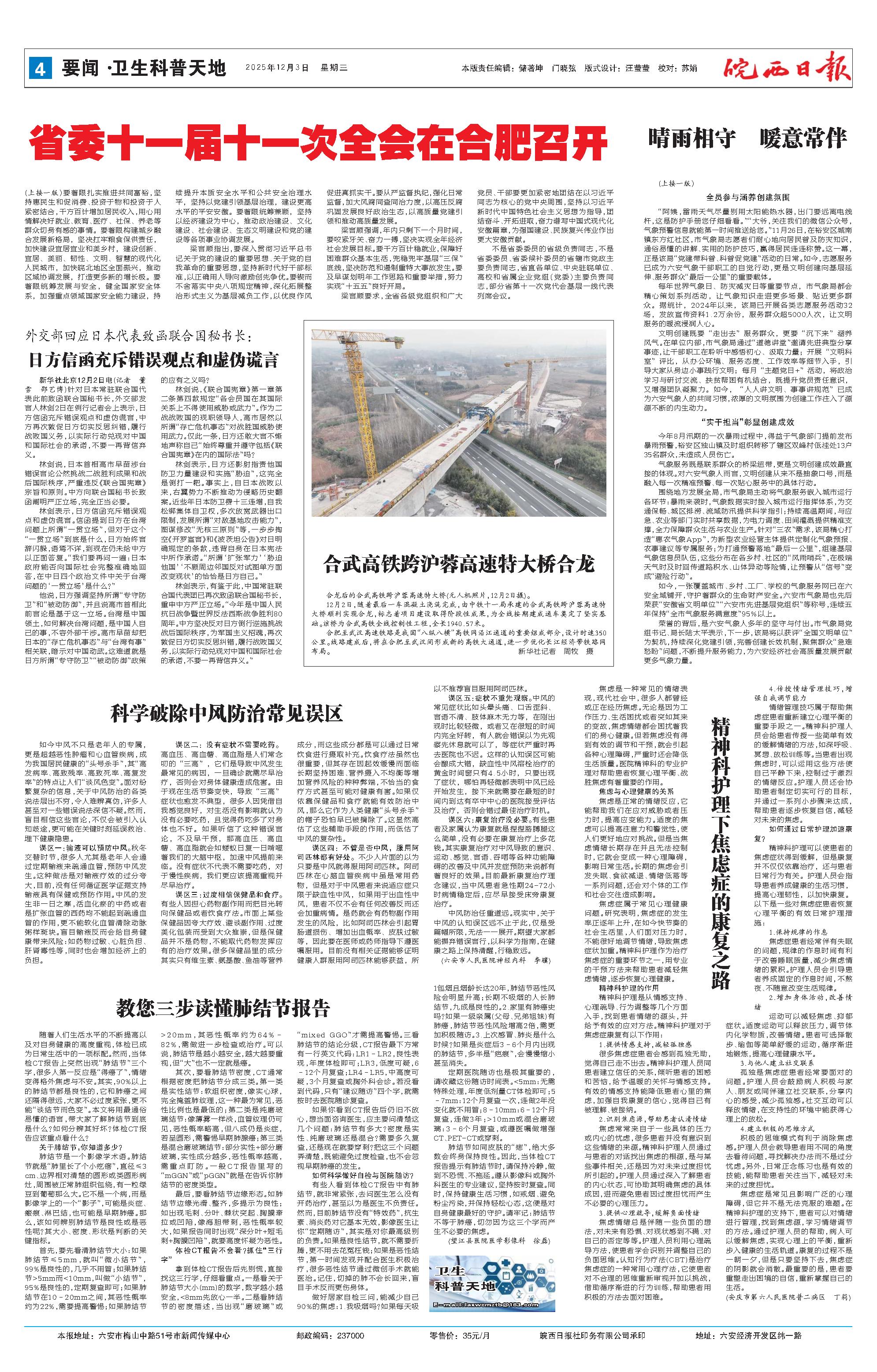 如今中风不只是老年人的专属,更是超越恶性肿瘤和心血管疾病,成为我国居民健康的“头号杀手”,其“高发病率、高致残率、高致死率、高复发率”的特点让人们“谈风色变”。面对纷繁复杂的信息,关于中风防治的各类说法层出不穷,令人难辨真伪,许多人甚至对一些错误说法深信不疑。然而,盲目相信这些言论,不仅会被引入认知歧途,更可能在关键时刻延误救治、埋下健康隐患。 误区一:输液可以预防中风。秋冬交替时节,很多人尤其是老年人会通过定期输液来疏通血管,预防中风发生。这种做法是对输液疗效的过分夸大,目前,没有任何循证医学证据支持输液具有保健或预防作用。中风的发生非一日之寒,活血化瘀的中药或者是扩张血管的西药均不能起到疏通血管的作用,更不能软化血管清除动脉粥样斑块。盲目输液反而会给自身健康带来风险:如药物过敏、心脏负担、肝肾毒性等,同时也会增加经济上的负担。 误区二:没有症状不需要吃药。高血压、高血糖、高血脂是人们常念叨的“三高”,它们是导致中风发生最常见的病因,一旦确诊就需尽早治疗,否则会对身体健康造成危害。由于现在生活节奏变快,导致“三高”症状也愈发不典型,很多人因凭借自我感觉良好,对生活没有影响就认为没有必要吃药,且觉得药吃多了对身体也不好。如果听信了这种错误言论,不及早干预,那高血压、高血糖、高血脂就会如蝼蚁日复一日啃噬着我们的大脑中枢,加速中风提前来临。没有症状不代表不需要吃药,对于慢性疾病,我们更应该提高重视并尽早治疗。 误区三:过度相信保健品和食疗。有些人因担心药物副作用而把目光转向保健品或者饮食疗法。市面上某些保健品因夸大疗效、避谈副作用、过度美化包装而受到大众推崇,但是保健品并不是药物,不能取代药物发挥应有的治疗效果。很多保健品里的成分其实只有维生素、氨基酸、鱼油等营养成分,而这些成分都是可以通过日常饮食进行摄取补充。饮食疗法虽然也很重要,但其存在因起效缓慢而面临长期坚持困难、营养摄入不均衡等增加营养风险的种种弊端,不恰当的食疗方式甚至可能对健康有害。如果仅依靠保健品和食疗就能有效防治中风,那么它作为人类健康“头号杀手”的帽子恐怕早已被摘除了。这显然高估了这些辅助手段的作用,而低估了中风的复杂性。 误区四:不管是否中风,服用阿司匹林都有好处。不少人片面的以为只要是中风就得服用阿司匹林。阿司匹林在心脑血管疾病中虽是常用药物,但是对于中风患者来说适应症只限于缺血性中风,如果用于出血性中风,患者不仅不会有任何改善反而还会加重病情。是药就会有药物副作用发生的风险,比如阿司匹林会引起胃肠道损伤、增加出血概率、皮肤过敏等,因此要在医师或药师指导下遵医嘱服用。目前没有相关证据能够证明健康人群服用阿司匹林能够获益,所以不推荐盲目服用阿司匹林。 误区五:症状不重先观察。中风的常见症状比如头晕头痛、口舌歪斜、言语不清、肢体麻木无力等,在刚出现时比较轻微,或者又在很短的时间内完全好转,有人就会错误以为先观察先休息就可以了,等症状严重时再去医院也不迟。这样的认知误区可能会酿成大错,缺血性中风溶栓治疗的黄金时间窗只有4.5小时,只要出现了症状,哪怕再轻微都表明中风已经开始发生,接下来就需要在最短的时间内到达有卒中中心的医院接受评估及治疗,否则会错过最佳治疗时机。 误区六:康复治疗没必要。有些患者及家属认为康复就是捏捏胳膊腿这么简单,没有必要在康复治疗上多花钱。其实康复治疗对中风导致的意识、运动、感觉、言语、吞咽等各种功能障碍的改善及中风并发症预防来说都有着良好的效果。目前最新康复治疗理念建议,当中风患者急性期24-72小时病情稳定后,应尽早接受床旁康复治疗。 中风防治任重道远。现实中,关于中风的认知误区远不止于此,仅是受篇幅所限,无法一一展开。期望大家都能摒弃错误言行,以科学为指南,在健康之路上保持清醒,行稳致远。 (六安市人民医院神经内科 李骥)