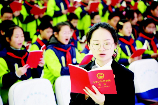 今年12月4日是第十二个国家宪法日。12月3日,裕安区人民法院联合六安市城北小学开展“弘扬宪法精神 争做守法少年”主题活动,通过宪法诵读、专题讲座、知识问答、互动游戏等形式,推动宪法知识普及,营造“学法、懂法、守法、用法”的良好氛围,让同学们在轻松的氛围中加深对宪法知识的理解,引导大家从小学习宪法知识、弘扬宪法精神,培养遵守宪法意识,为青少年健康成长筑牢法治屏障。 图为法官带领同学们诵读宪法。 本报记者 田凯平 摄