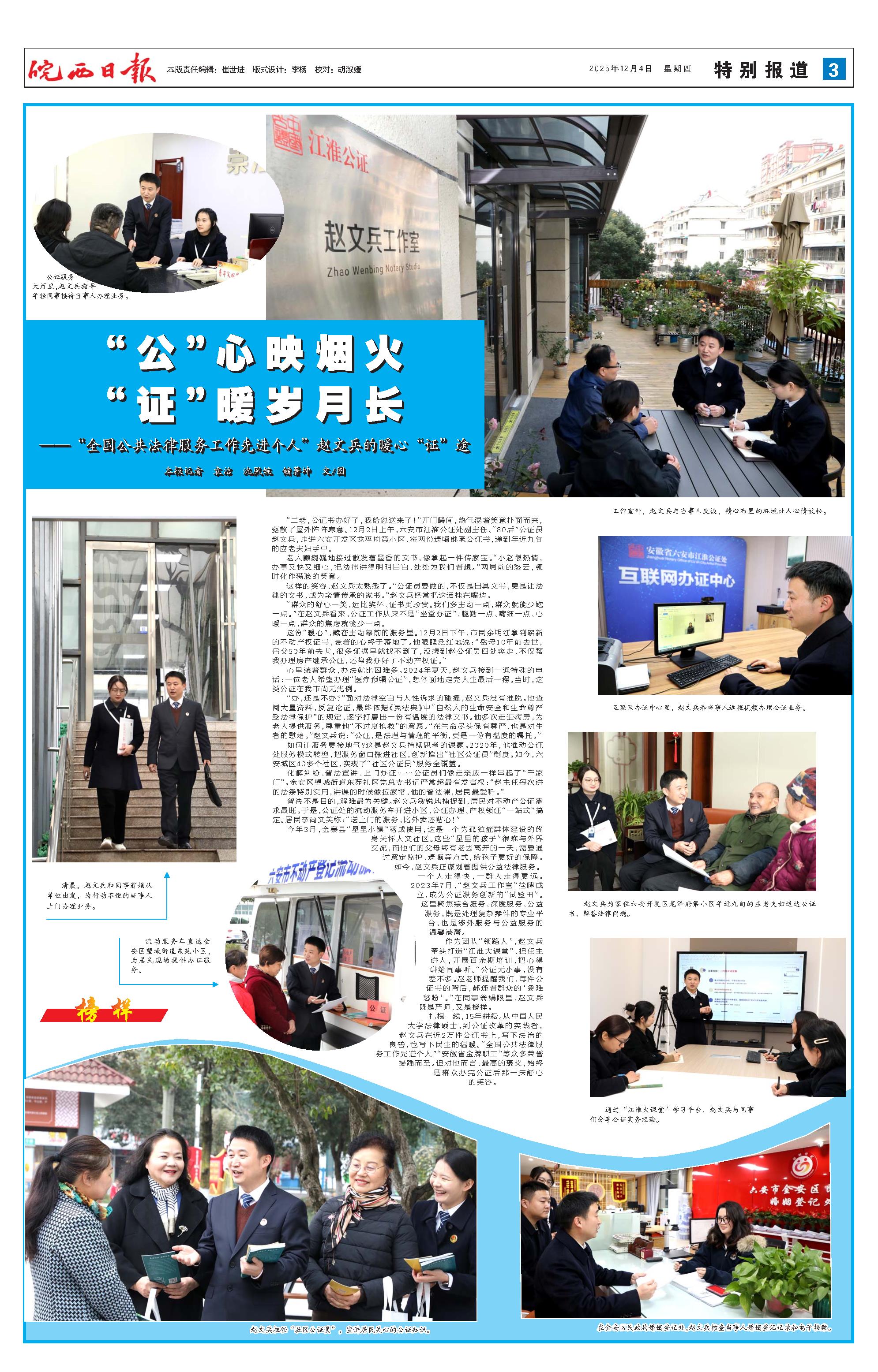 榜样 “二老,公证书办好了,我给您送来了!”开门瞬间,热气混着笑意扑面而来,驱散了屋外阵阵寒意。12月2日上午,六安市江淮公证处副主任、“80后”公证员赵文兵,走进六安开发区龙泽府第小区,将两份遗嘱继承公证书,递到年近九旬的应老夫妇手中。 老人颤巍巍地接过散发着墨香的文书,像拿起一件传家宝。“小赵很热情,办事又快又细心,把法律讲得明明白白,处处为我们着想。”两周前的愁云,顿时化作满脸的笑意。 这样的笑容,赵文兵太熟悉了。“公证员要做的,不仅是出具文书,更是让法律的文书,成为亲情传承的家书。”赵文兵经常把这话挂在嘴边。 “群众的舒心一笑,远比奖杯、证书更珍贵。我们多主动一点,群众就能少跑一点。”在赵文兵看来,公证工作从来不是“坐堂办证”,腿勤一点、嘴细一点、心暖一点,群众的焦虑就能少一点。 这份“暖心”,藏在主动靠前的服务里。12月2日下午,市民余明江拿到崭新的不动产权证书,悬着的心终于落地了。他眼眶泛红地说:“岳母10年前去世,岳父50年前去世,很多证据早就找不到了,没想到赵公证员四处奔走,不仅帮我办理房产继承公证,还帮我办好了不动产权证。” 心里装着群众,办法就比困难多。2024年夏天,赵文兵接到一通特殊的电话:一位老人希望办理“医疗预嘱公证”,想体面地走完人生最后一程。当时,这类公证在我市尚无先例。 “办,还是不办?”面对法律空白与人性诉求的碰撞,赵文兵没有推脱。他查阅大量资料,反复论证,最终依据《民法典》中“自然人的生命安全和生命尊严受法律保护”的规定,逐字打磨出一份有温度的法律文书。他多次走进病房,为老人提供服务,尊重他“不过度抢救”的意愿。“在生命尽头保有尊严,也是对生者的慰藉。”赵文兵说:“公证,是法理与情理的平衡,更是一份有温度的嘱托。” 如何让服务更接地气?这是赵文兵持续思考的课题。2020年,他推动公证处服务模式转型,把服务窗口搬进社区,创新推出“社区公证员”制度。如今,六安城区40多个社区,实现了“社区公证员”服务全覆盖。 化解纠纷、普法宣讲、上门办证……公证员们像走亲戚一样串起了“千家门”。金安区望城街道东苑社区党总支书记严常超最有发言权:“赵主任每次讲的法条特别实用,讲课的时候像拉家常,他的普法课,居民最爱听。” 普法不是目的,解难最为关键。赵文兵敏锐地捕捉到,居民对不动产公证需求最旺。于是,公证处的流动服务车开进小区,公证办理、产权领证“一站式”搞定。居民李尚文笑称:“送上门的服务,比外卖还贴心!” 今年3月,金寨县“星星小镇”落成使用,这是一个为孤独症群体建设的终身关怀人文社区。这些“星星的孩子”很难与外界交流,而他们的父母终有老去离开的一天,需要通过意定监护、遗嘱等方式,给孩子更好的保障。如今,赵文兵正谋划着提供公益法律服务。 一个人走得快,一群人走得更远。2023年7月,“赵文兵工作室”挂牌成立,成为公证服务创新的“试验田”。这里聚焦综合服务、深度服务、公益服务,既是处理复杂案件的专业平台,也是涉外服务与公益服务的温馨港湾。 作为团队“领路人”,赵文兵牵头打造“江淮大课堂”,担任主讲人,开展百余期培训,把心得讲给同事听。“公证无小事,没有差不多。赵老师提醒我们,每件公证书的背后,都连着群众的‘急难愁盼’。”在同事翁娟眼里,赵文兵既是严师,又是榜样。 扎根一线,15年耕耘。从中国人民大学法律硕士,到公证改革的实践者,赵文兵在近2万件公证书上,写下法治的良善,也写下民生的温暖。“全国公共法律服务工作先进个人”“安徽省金牌职工”等众多荣誉接踵而至。但对他而言,最高的褒奖,始终是群众办完公证后那一抹舒心的笑容。