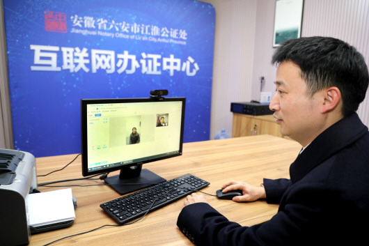 互联网办证中心里,赵文兵和当事人远程视频办理公证业务。