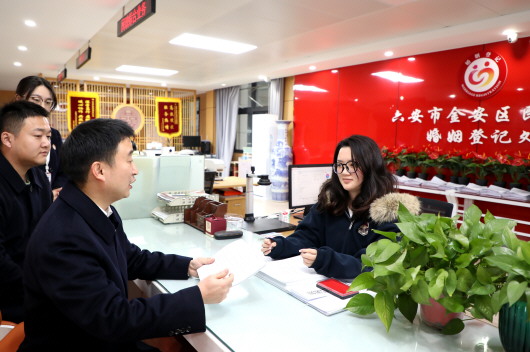 在金安区民政局婚姻登记处,赵文兵核查当事人婚姻登记记录和电子档案。