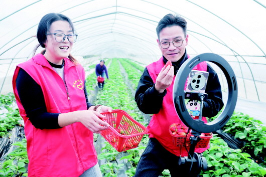 12月4日,党员志愿者在长兴县和平镇便民桥村蜜甜家庭农场大棚内给种植户直播带货。 近年来,浙江省湖州市长兴县和平镇从种植、生产、销售等各环节入手,通过“选良种”“提技术”“推标准”“强组织”等方式,推进农业产业现代化、标准化、专业化、数字化发展,切实提高农产品品质。同时推进品牌与种植加工紧密结合,以品牌覆盖带动种植和销售终端。 目前,和平镇有优质水果产业8000余亩,主要以葡萄、水蜜桃、蜜梨、红美人柑橘、草莓等为主。当地依托现代农业资源,开启农园四季休闲采摘旅游,发布蔬果采摘等研学线路,助力特色乡村旅游发展。 新华社记者 徐昱 摄