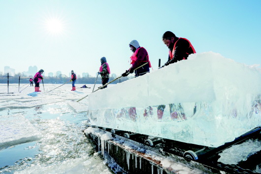 眼下,“冰城”哈尔滨采冰工作全面展开,采冰工人从松花江上采出优质冰料,源源不断地运往冰雪大世界园区等地,用于景观建设。 新华社记者 王建威 摄