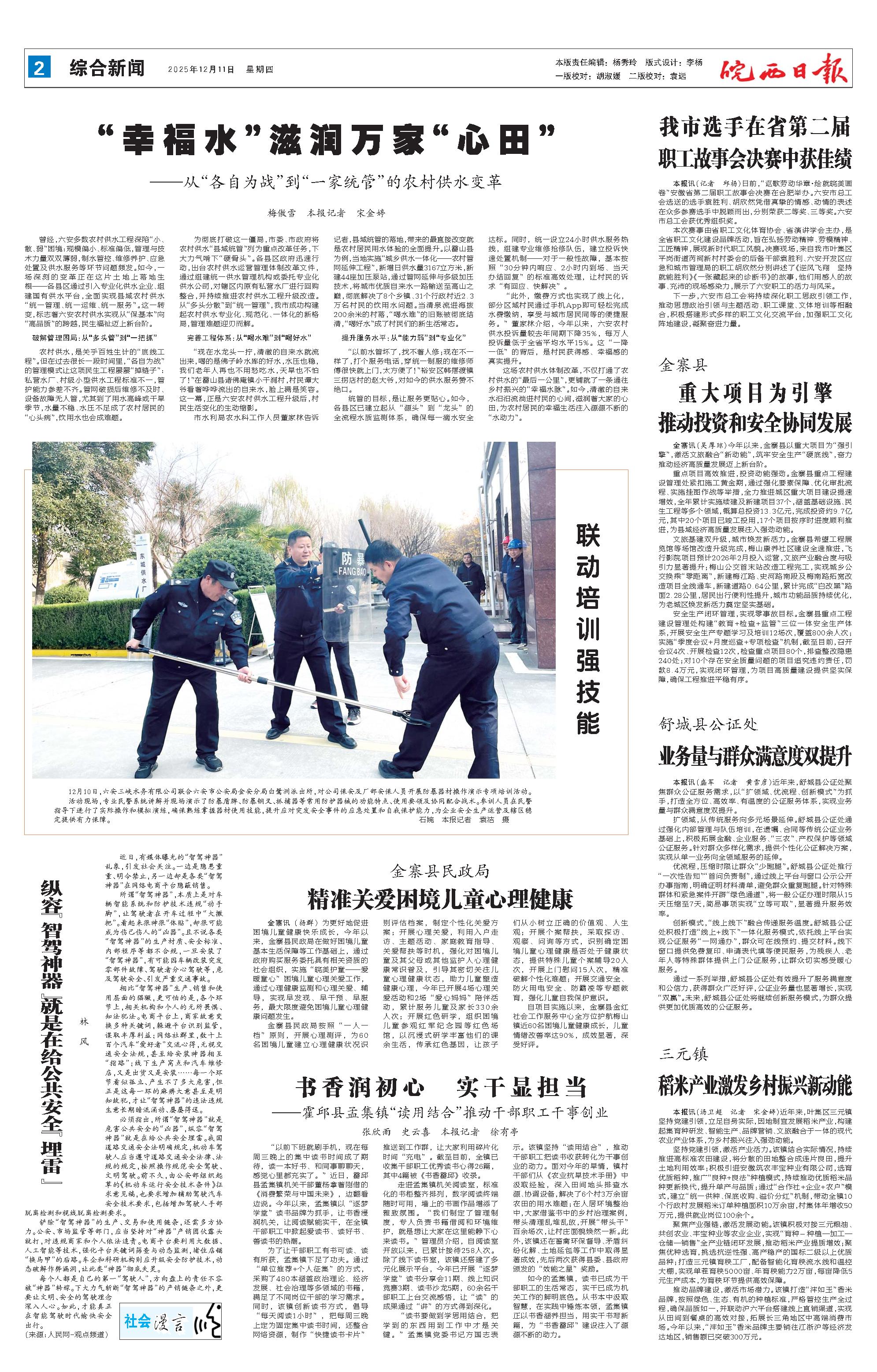 曾经,六安多数农村供水工程深陷“小、散、弱”困境:规模偏小、标准偏低,管理与技术力量双双薄弱,制水管控、维修养护、应急处置及供水服务等环节问题频发。如今,一场深刻的变革正在这片土地上落地生根——各县区通过引入专业化供水企业、组建国有供水平台,全面实现县域农村供水“统一管理、统一运维、统一服务”。这一转变,标志着六安农村供水实现从“保基本”向“高品质”的跨越,民生福祉迈上新台阶。 破解管理困局:从“多头管”到“一把抓” 农村供水,是关乎百姓生计的“底线工程”。但在过去很长一段时间里,“各自为战”的管理模式让这项民生工程屡屡“掉链子”:私营水厂、村级小型供水工程标准不一,管护能力参差不齐。管网破损后维修不及时、设备故障无人管,尤其到了用水高峰或干旱季节,水量不稳、水压不足成了农村居民的“心头病”,饮用水也会成难题。 为彻底打破这一僵局,市委、市政府将农村供水“县域统管”列为重点改革任务,下大力气啃下“硬骨头”。各县区政府迅速行动,出台农村供水运营管理体制改革文件,通过组建统一供水管理机构或委托专业化供水公司,对辖区内原有私营水厂进行回购整合,并持续推进农村供水工程升级改造。从“多头分散”到“统一管理”,我市成功构建起农村供水专业化、规范化、一体化的新格局,管理难题迎刃而解。 完善工程体系:从“喝水难”到“喝好水” “现在水龙头一拧,清澈的自来水就流出来,喝的是佛子岭水库的好水,水压也稳,我们老年人再也不用愁吃水,天旱也不怕了!”在霍山县诸佛庵镇小干涧村,村民谭大爷看着哗哗流出的自来水,脸上满是笑容。这一幕,正是六安农村供水工程升级后,村民生活变化的生动缩影。 市水利局农水科工作人员董家林告诉记者,县域统管的落地,带来的最直接改变就是农村居民用水体验的全面提升。以霍山县为例,当地实施“城乡供水一体化——农村管网延伸工程”,新增日供水量3167立方米,新建44座加压泵站,通过管网延伸与多级加压技术,将城市优质自来水一路输送至高山之巅,彻底解决了8个乡镇、31个行政村近2.3万名村民的饮用水问题。当清泉流进海拔200余米的村落,“喝水难”的旧账被彻底结清,“喝好水”成了村民们的新生活常态。 提升服务水平:从“能力弱”到“专业化” “以前水管坏了,找不着人修;现在不一样了,打个服务电话,穿统一制服的维修师傅很快就上门,太方便了!”裕安区韩摆渡镇三拐店村的赵大爷,对如今的供水服务赞不绝口。 统管的目标,是让服务更贴心。如今,各县区已建立起从“源头”到“龙头”的全流程水质监测体系,确保每一滴水安全达标。同时,统一设立24小时供水服务热线,组建专业维修抢修队伍,建立投诉快速处置机制——对于一般性故障,基本按照“30分钟内响应、2小时内到场、当天办结回复”的标准高效处理,让村民的诉求“有回应、快解决”。 “此外,缴费方式也实现了线上化,部分区域村民通过手机App即可轻松完成水费缴纳,享受与城市居民同等的便捷服务。”董家林介绍,今年以来,六安农村供水投诉量较去年同期下降35%,每万人投诉量低于全省平均水平15%。这“一降一低”的背后,是村民获得感、幸福感的真实提升。 这场农村供水体制改革,不仅打通了农村供水的“最后一公里”,更铺就了一条通往乡村振兴的“幸福水脉”。如今,清澈的自来水汩汩流淌进村民的心间,滋润着大家的心田,为农村居民的幸福生活注入源源不断的“水动力”。
