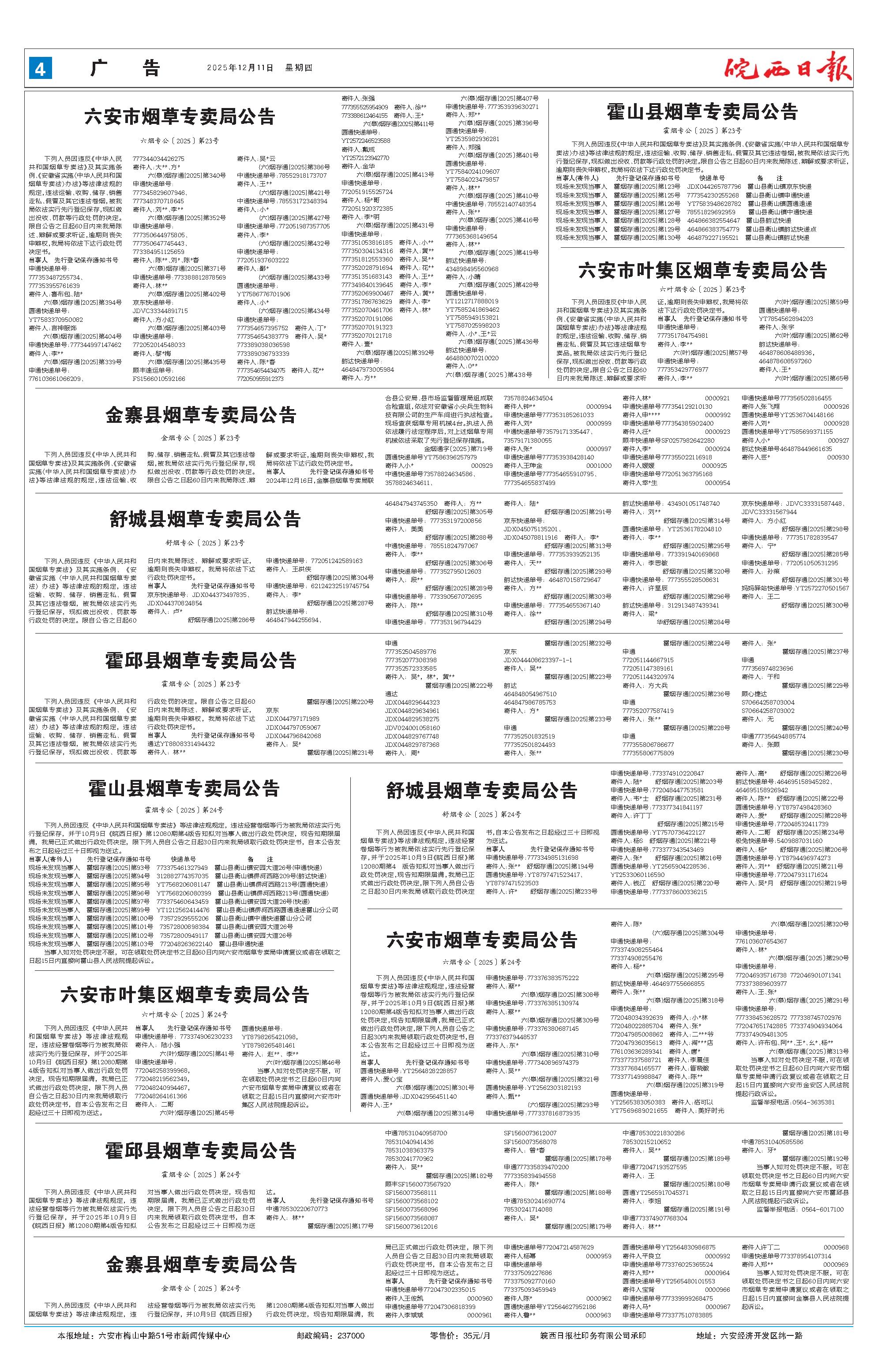 下列人员因违反《中华人民共和国烟草专卖法》及其实施条例、《安徽省实施〈中华人民共和国烟草专卖法〉办法》等法律法规的规定,违法运输、收购、储存、销售走私、假冒及其它违法卷烟,被我局依法实行先行登记保存,现拟做出没收、罚款等行政处罚的决定。限自公告之日起60日内来我局陈述、辩解或要求听证,逾期则丧失申辩权,我局将依法下达行政处罚决定书。 当事人 先行登记保存通知书号 2024年12月16日,金寨县烟草专卖局联合县公安局、县市场监督管理局组成联合检查组,依法对安徽省小尖兵生物科技有限公司的生产车间进行执法检查。现场查获烟草专用机械4台。执法人员依法履行法定程序后,对上述烟草专用机械依法采取了先行登记保存措施。 金烟通字〔2025〕第719号 圆通快递单号YT7586396257979 寄件人小* 000929 中通快递单号73578824634586、 3578824634611、 73578824634504 寄件人钟** 0000994 申通快递单号777353185261033 寄件人刘* 0000999 中通快递单号73579171335447、 73579171380055 寄件人张* 0000997 申通快递单号777353938428140 寄件人王珅金 0001000 申通快递单号777354655910795、 777354655837499 寄件人林* 0000921 申通快递单号777354129210130 寄件人申**** 0000992 申通快递单号777354385902400 寄件人汪* 0000923 顺丰快递单号SF0257982642280 寄件人李* 0000924 申通快递单号777355022116918 寄件人媛媛 0000925 申通快递单号772051363795168 寄件人幸*生 0000954 申通快递单号777356502816455 寄件人张飞翔 0000926 圆通快递单号YT2536704148166 寄件人刘* 0000928 圆通快递单号YT7585699371155 寄件人小* 000927 韵达快递单号464878449661635 寄件人芸* 000930