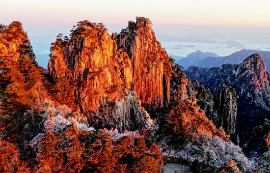 雪后初霁的安徽省黄山风景区银装素裹,初升的朝阳与奇松、怪石交相映衬,吸引众多游客前来赏雪观景。