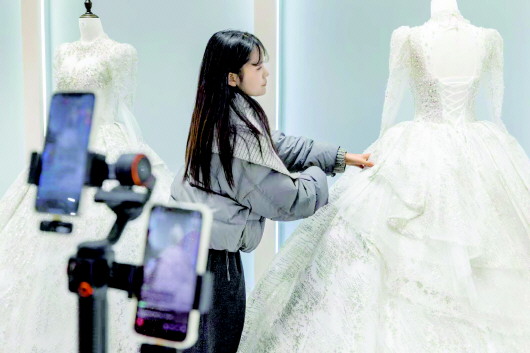 12月19日,在裕安区丁集镇婚纱生产基地一家企业直播间内,一件件缀满珍珠的婚纱在灯光下流光溢彩,主播正通过电商平台向线上客户展示新款婚纱。据了解,今年该镇婚纱产业总产值预计达24亿元,其中约13亿元的线上交易额尤其亮眼,这种依托“线下生产+线上直播”的模式,使丁集镇正从传统制造基地转型为数字化外贸枢纽,让“幸福产业”在云端绽放。
