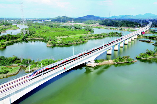 12月22日,从湛江北站开往广州白云站的列车驶过丰头河特大桥。 12月22日,广州至湛江高铁开通运营,广州白云站至湛江北站最快1小时32分可达。 据了解,广湛高铁设计时速350公里、正线全长约401公里。通车运营后,阳江、茂名、湛江三市结束不通时速350公里高铁的历史,标志着广东向着“市市通350高铁”目标迈出坚实一步。 新华社发(魏婕 摄)