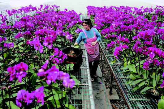 12月23日,甘肃省定西市临洮县一花卉种植基地的工人在管护蝴蝶兰。