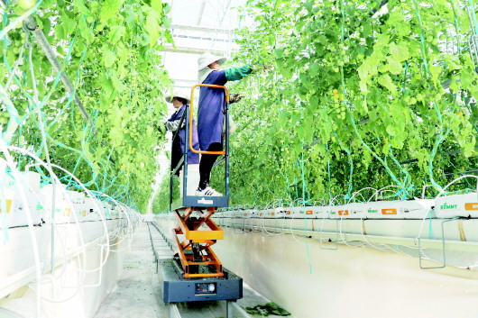12月16日,舒城县桃溪农业科技园的智慧农业温室大棚内,工人们正为无土栽培的番茄疏果、打叉。这座1万平方米的温室大棚通过水肥一体化控制系统进行科学种植,不仅实现污水“零排放”,番茄亩产更超过万斤。