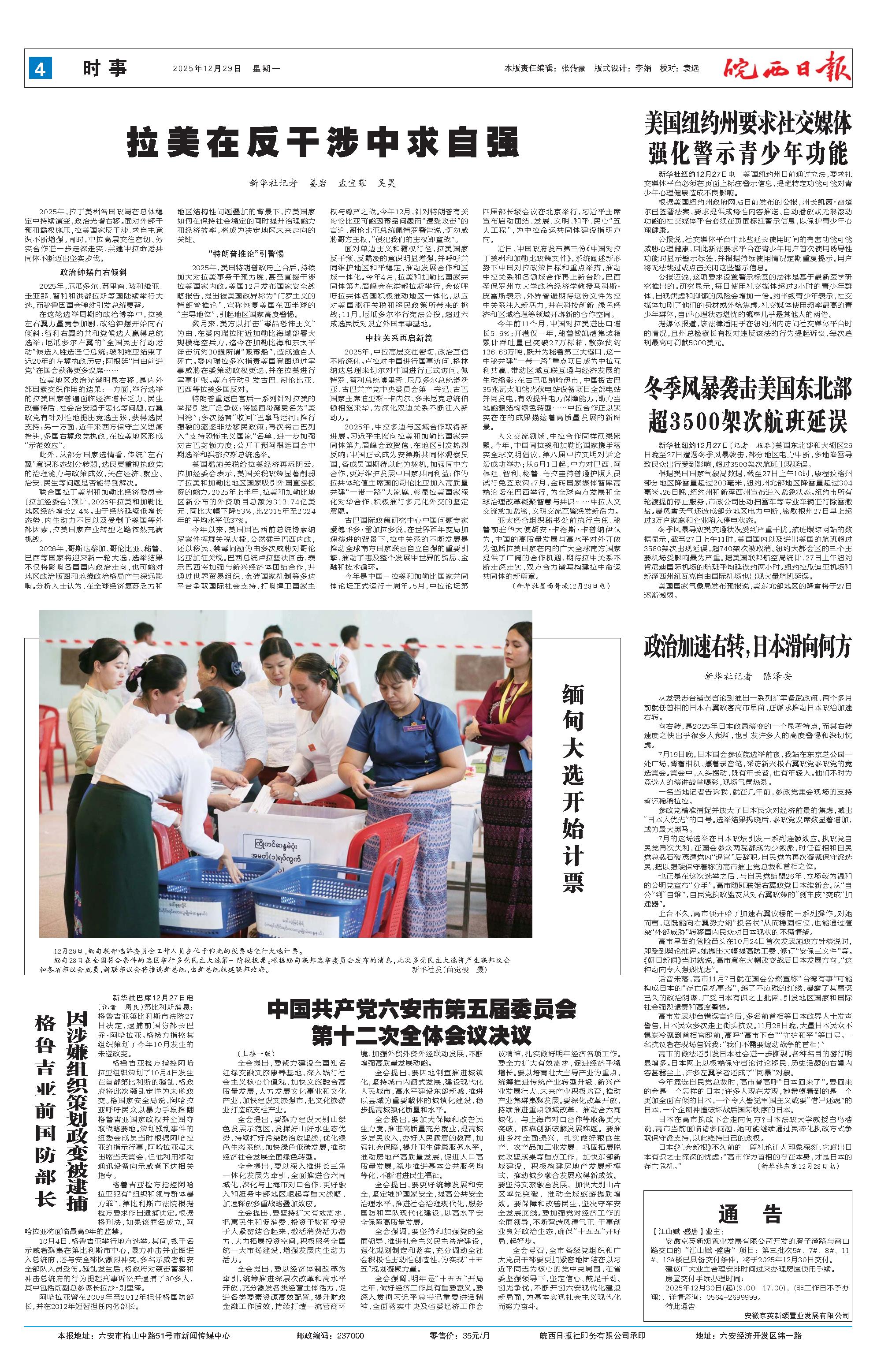 中国共产党六安市第五届委员会第十二次全体会议暨市委经济工作会议于2025年12月27日举行。出席这次全会的有市委委员34人,市委候补委员7人,部分市第五次党代会基层一线代表和有关方面负责同志列席会议。 全会由市委常委会主持。全会传达学习了党的二十届四中全会、中央经济工作会议及省委十一届十一次全会、省委经济工作会议精神,听取和讨论了市委常委会工作报告,审议通过了《中共六安市委关于制定六安市国民经济和社会发展第十五个五年规划的建议》。市委书记方正代表市委常委会作了讲话,就《建议(讨论稿)》向全会作了说明,对做好明年经济工作作了部署。市委副书记、市长刘洪洁对明年经济工作作了具体安排。 会议认为,党的二十届四中全会对我国未来五年发展作出顶层设计和战略擘画,中央经济工作会议对做好明年经济工作进行系统部署,习近平总书记的重要讲话,深刻阐明了事关经济社会发展的一系列重大问题,为我们科学谋划“十五五”、做好明年经济工作提供了根本遵循。要把学习贯彻党的二十届四中全会和中央经济工作会议精神作为当前和今后一个时期的重大政治任务,与贯彻落实习近平总书记考察安徽重要讲话精神结合起来,按照省委部署要求,牢记嘱托、感恩奋进,以实际行动深刻领悟“两个确立”的决定性意义、坚决做到“两个维护”。 全会充分肯定了市委常委会今年以来的工作。一致认为,市委常委会深入贯彻落实党的二十大和二十届历次全会精神,全面贯彻习近平总书记考察安徽重要讲话精神,坚持稳中求进工作总基调,完整准确全面贯彻新发展理念,多措并举推动经济平稳运行,扎实开展深入贯彻中央八项规定精神学习教育,统筹发展和安全,纵深推进全面从严治党,社会大局和谐稳定。 全会充分肯定“十四五”时期六安发展取得的重大成就。“十四五”时期,全市上下迎难而上、锐意进取,推动经济社会发展稳步向前,六安现代化建设迈出坚实步伐。这些成绩的取得,根本在于习近平新时代中国特色社会主义思想科学指引,在于党中央及省委的坚强领导,也是全市上下攻坚克难、真抓实干的结果。 全会强调,“十五五”时期在基本实现社会主义现代化进程中具有承前启后的重要地位,也是六安夯实基础、全面发力、奋力追赶的关键时期。必须坚持马克思列宁主义、毛泽东思想、邓小平理论、“三个代表”重要思想、科学发展观,全面贯彻习近平新时代中国特色社会主义思想,深入贯彻党的二十大和二十届历次全会精神,认真贯彻习近平总书记考察安徽重要讲话精神,统筹推进“五位一体”总体布局,协调推进“四个全面”战略布局,完整准确全面贯彻新发展理念,坚持稳中求进工作总基调,坚持以经济建设为中心,以推动高质量发展为主题,以改革创新为根本动力,以满足人民日益增长的美好生活需要为根本目的,以全面从严治党为根本保障,锚定“三地一区”总体定位,以深入推进长三角一体化发展为牵引,以合六同城化为核心,坚持工业强市主战略,推动经济实现质的有效提升和量的合理增长,让老区人民过上更加幸福美好生活,确保基本实现社会主义现代化取得决定性进展。 全会提出了“十五五”时期六安经济社会发展主要目标:高质量发展迈上新台阶,科技创新能力得到新加强,深化改革开放实现新突破,人民生活品质得到新提升,绿色转型发展取得新进展,社会文明程度和治理效能达到新水平。在此基础上再奋斗五年,到二〇三五年基本实现社会主义现代化。 全会提出,要聚力建设合六同城协同创新产业基地,把发展经济的着力点放在实体经济上,坚定不移实施工业强市主战略,因地制宜发展新质生产力,加快产业转型升级,建设合六科创走廊,促进服务业优质高效发展,建设现代化基础设施体系,加快数字六安建设,构建具有六安特色的现代化产业体系。 全会提出,要聚力建设长三角绿色农产品生产加工供应基地,大力发展现代农业,推进宜居宜业和美乡村建设,落实强农惠农富农政策,加快农业农村现代化,推动乡村全面振兴走在前列。 (下转四版) (上接一版) 全会提出,要聚力建设全国知名红绿交融文旅康养基地,深入践行社会主义核心价值观,加快文旅融合高质量发展,大力发展文化事业和文化产业,加快建设文旅强市,把文化旅游业打造成支柱产业。 全会提出,要聚力建设大别山绿色发展示范区,发挥好山好水生态优势,持续打好污染防治攻坚战,优化绿色生态系统,加快绿色低碳发展,推动经济社会发展全面绿色转型。 全会提出,要以深入推进长三角一体化发展为牵引,全面推进合六同城化,深化与上海市对口合作,更好融入和服务中部地区崛起等重大战略,加速释放多重战略叠加效应。 全会提出,要坚持扩大有效需求,把惠民生和促消费、投资于物和投资于人紧密结合起来,激活消费活力潜力,大力拓展投资空间,积极服务全国统一大市场建设,增强发展内生动力活力。 全会提出,要以经济体制改革为牵引,统筹推进深层次改革和高水平开放,充分激发各类经营主体活力,促进各类要素资源高效配置,提升财政金融工作质效,持续打造一流营商环境,加强外贸外资外经联动发展,不断增强高质量发展动能。 全会提出,要因地制宜推进城镇化,坚持城市内涵式发展,建设现代化人民城市,高水平建设东部新城,推进以县城为重要载