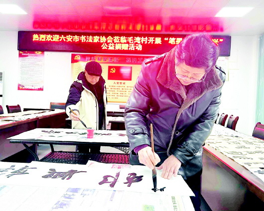 2025年12月31日,六安市书法家协会组织书法家们走进金安区东河口镇毛湾村,开展“笔墨丹青助振兴”公益捐赠活动。 活动现场,书法家们不仅带来了精心准备的书法作品,更在现场挥毫创作,将一幅幅寓意吉祥的书法作品赠予乡村,以翰墨书香传递文化关怀,助力乡村文化振兴。当天,爱心人士还为村里困难群体送去米、油等生活物资,传递温暖与关怀。 本报记者 张玉 摄