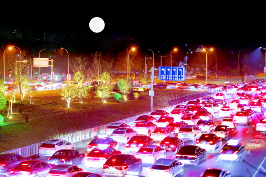 1月3日晚,2026年首个“超级月亮”现身天宇,悄然悬挂于皋城夜空,为夜色增添一抹清辉。当晚恰逢元旦小长假最后一天,G312六安城区段返程晚高峰的车流与圆润的明月相映成趣,为返岗的人们照亮归途(二次曝光)。