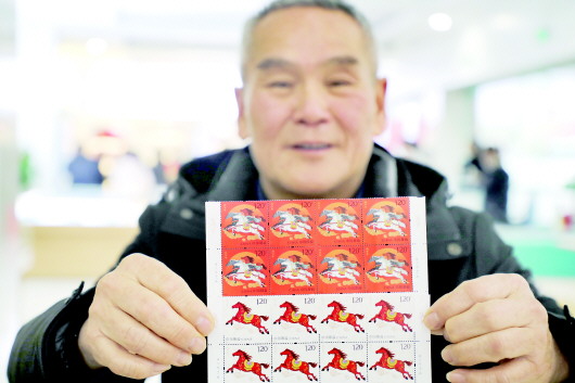 1月5日,市区解放路六安邮政公司集邮营业厅,集邮爱好者高飞在展示自己购买的第四套马年生肖特种邮票。 当日,六安邮政公司举行《丙午年》特种邮票首发仪式。据了解,《丙午年》马年生肖特种邮票一套两枚,图案分别为“驰跃宏图”和“万骏臻福”,全套邮票面值为2.4元。其中,“驰跃宏图”以红马腾跃于祥云之上为核心意象,尽显“一马当先”的开拓气概;“万骏臻福”则以三匹骏马并肩疾驰,寓意团结奋进的磅礴力量。该特种邮票将马的形象与新时代中国人民奋发进取的精神风貌巧妙结合,方寸之间既见“一马当先”的开拓气概,亦显“万马奔腾”的团结力量。 本报记者 田凯平 摄
