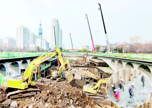 1月6日,六安城区五里墩大桥拆除重建项目施工现场,工人正在进行新建中幅桥西侧承台基础施工(小图)。 据了解,随着1月5日原老桥主体结构顺利拆除完毕,五里墩大桥拆除重建工程建设摁下“加速键”。为保障施工安全高效,市重点工程处提前统筹,与供水、供电、供气、通信等12家管线单位协同会商20余次,高效完成108道管线临时迁改任务,为工程全面展开奠定基础。目前,项目已完成老桥整体拆除及两侧新建边幅桥主体施工,将全面转入中幅桥建设阶段。 大图:各项大型机械协同作业,对新建中幅桥进行基础施工。 本报记者 黄雪彦/文 田凯平/图