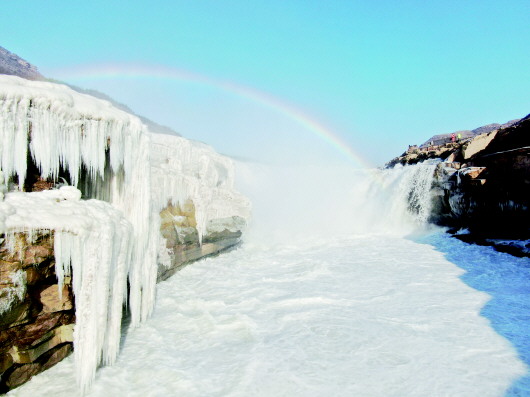 受持续降温天气影响,位于山西吉县和陕西宜川县交界的黄河壶口瀑布形成“冰瀑玉壶”壮美景观,层层叠叠的冰瀑与瀑布上空的彩虹相映成趣,美不胜收。