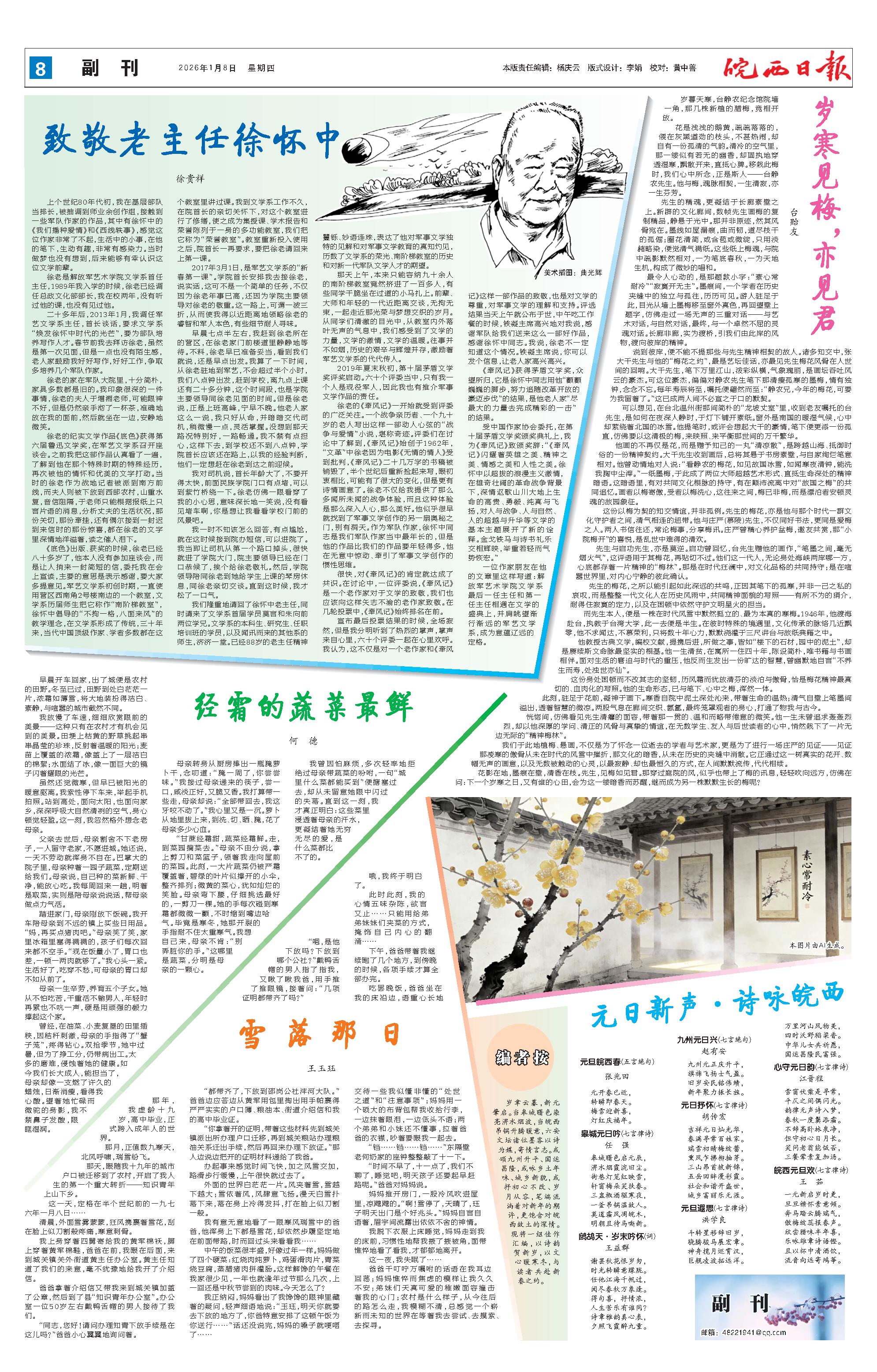 上个世纪80年代初,我在基层部队当排长,被抽调到师业余创作组,接触到一些军队作家的作品,其中有徐怀中的《我们播种爱情》和《西线轶事》,感觉这位作家非常了不起,生活中的小事,在他的笔下,生动有趣,非常有感染力。当时做梦也没有想到,后来能够有幸认识这位文学前辈。 徐老是解放军艺术学院文学系首任主任,1989年我入学的时候,徐老已经调任总政文化部部长,我在校两年,没有听过他的课,也没有见过他。 二十多年后,2013年1月,我调任军艺文学系主任,首长谈话,要求文学系“焕发徐怀中时代的光芒”,要为部队培养写作人才。春节前我去拜访徐老,虽然是第一次见面,但是一点也没有陌生感,老人家鼓励我好好写作,好好工作,争取多培养几个军队作家。 徐老的家在军队大院里,十分简朴,家具多数都是旧的。我印象很深的一件事情,徐老的夫人于增湘老师,可能眼神不好,但是仍然亲手沏了一杯茶,准确地放在我的面前,然后就坐在一边,安静地微笑。 徐老的纪实文学作品《底色》获得第六届鲁迅文学奖,在军艺文学系召开座谈会。之前我把这部作品认真看了一遍,了解到他在那个特殊时期的特殊经历,再次被他的情怀和优美的文字打动。当时的徐老作为战地记者被派到南方前线,而夫人则被下放到西部农村,山重水复,音信阻隔,于老师只能根据报纸上只言片语的消息,分析丈夫的生活状况,那份关切,那份牵挂,还有偶尔接到一封迟到来信时的那份惊喜,都在徐老的文字里深情地洋溢着,读之催人泪下。 《底色》出版、获奖的时候,徐老已经八十多岁了,他本人没有参加座谈会,而是让人捎来一封简短的信,委托我在会上宣读,主要的意思是表示感谢,要大家多提意见。军艺文学系初创时期,一直使用营区西南角2号楼南边的一个教室,文学系历届师生把它称作“南阶梯教室”,徐怀中倡导的“不拘一格,八面来风”的教学理念,在文学系形成了传统,三十年来,当代中国顶级作家、学者多数都在这个教室里讲过课。我到文学系工作不久,在院首长的亲切关怀下,对这个教室进行了修缮,使之成为集授课、学术报告和荣誉陈列于一身的多功能教室,我们把它称为“荣誉教室”。教室重新投入使用之后,院首长一再要求,要把徐老请回来上第一课。 2017年3月1日,是军艺文学系的“新春第一课”。学院首长安排我去接徐老,说实话,这可不是一个简单的任务,不仅因为徐老年事已高,还因为学院主要领导对徐老的敬重。这一路上,可谓一波三折,从而使我得以近距离地领略徐老的睿智和军人本色,有些细节耐人寻味。 早晨七点半左右,我赶到徐老所在的营区,在徐老家门前楼道里静静地等待。不料,徐老早已准备妥当,看到我们就说,还是早点出发。我算了一下时间,从徐老驻地到军艺,不会超过半个小时,我们八点钟出发,赶到学校,离九点上课还有二十多分钟,这个时间段,也是学院主要领导同徐老见面的时间。但是徐老说,正是上班高峰,宁早不晚。他老人家这么一说,我只好从命,并暗暗交代司机,稍微慢一点,灵活掌握。没想到那天路况特别好,一路畅通。我不禁有点担心,这样下去,到学校还不到八点钟,学院首长应该还在路上,以我的经验判断,他们一定想赶在徐老到达之前迎候。 我对司机说,首长年龄大了,不要开得太快,前面民族学院门口有点堵,可以到紫竹桥绕一下。徐老仿佛一眼看穿了我的小心思,意味深长地一笑说,没有看见堵车啊,你是想让我看看学校门前的风景吧。 我一时不知该怎么回答,有点尴尬,就在这时候接到院办短信,可以进院了。我当即让司机从第一个路口掉头,很快就进了学院大门,院主要领导已经在门口恭候了,挨个给徐老敬礼。然后,学院领导陪同徐老到她给学生上课的琴房休息,同徐老亲切交谈。直到这时候,我才松了一口气。 我们隆重地请回了徐怀中老主任,同时请来了文学系首届学员莫言和朱向前两位学兄。文学系的本科生、研究生、任职培训班的学员,以及闻讯而来的其他系的师生,济济一堂。已经88岁的老主任精神矍铄、妙语连珠,表达了他对军事文学独特的见解和对军事文学教育的真知灼见,历数了文学系的荣光、南阶梯教室的历史和对新一代军队文学人才的期望。 那天上午,本来只能容纳九十余人的南阶梯教室竟然挤进了一百多人,有些同学干脆坐在过道的小马扎上。前辈、大师和年轻的一代近距离交谈,无拘无束,一起走近那光荣与梦想交织的岁月。从同学们清澈的目光中,从教室内外落叶无声的气息中,我们感受到了文学的力量,文学的激情,文学的温暖。往事并不如烟,历史的艰辛与辉煌并存,激励着军艺文学系的代代传人。 2019年夏末秋初,第十届茅盾文学奖评奖启动。六十个评委当中,只有我一个人是现役军人,因此我也有推介军事文学作品的责任。 徐老的《牵风记》一开始就受到评委的广泛关注。一个战争亲历者、一个九十岁的老人写出这样一部动人心弦的“战争与爱情”小说,堪称奇迹。评委们在讨论中了解到,《牵风记》始创于1962年,“文革”中徐老因为电影《无情的情人》受到批判,《牵风记》二十几万字的书稿被销毁了,半个世纪后重新捡起来写,跟初衷相比,可能有了很大的变化,但是更有诗情画意了。徐老不仅给我提供了那么多闻所未闻的战争体验,而且这种体验是那么深入人心,那么美好。他似乎很早就找到了军事文学创作的另一