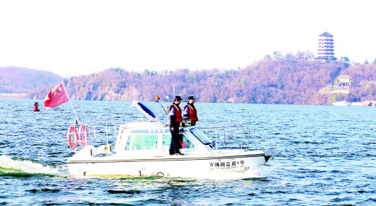 1月7日,舒城县公安局旅游度假区派出所组织警力在风景秀丽的万佛湖湖面上执行巡逻任务。