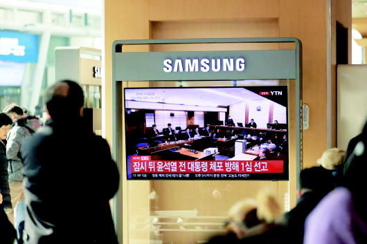 1月16日,在韩国首尔火车站,民众观看尹锡悦的庭审新闻。