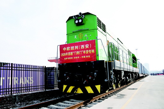 1月21日,中欧班列(西安)“门到门”年货专列开抵西安浐灞国际港爱菊农产品物流加工园区。 1月21日,2026年首趟中欧班列(西安)“门到门”年货专列满载着哈萨克斯坦成品粮油、蜂蜜等农产品驶抵西安。已连续开行三年的中欧班列(西安)“门到门”年货专列,实现从国外仓库发运到国内仓库收货的“门到门”运输,既有效提升货物运输效率、降低企业运输成本,又丰富春节市场供应。 新华社记者 李一博 摄
