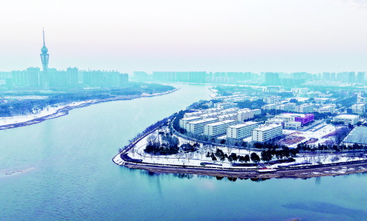 1月21日,雪后初霁的六安淠河国家湿地公园绿水荡漾,两岸银装素裹,宛若丹青。