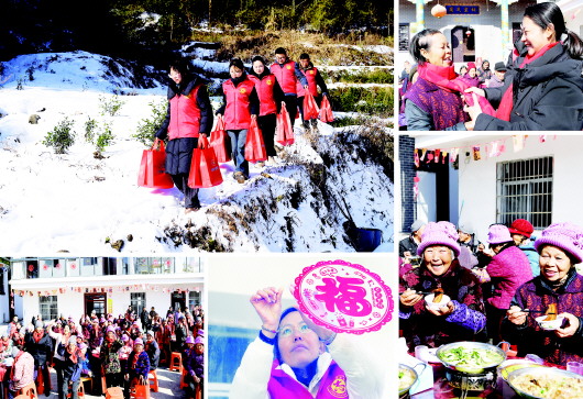 1月23日,大别山腹地的金寨县花石乡大湾村冰天雪地,严寒持续。大湾村“湾里人”志愿服务队开展为全村80岁以上的老人送温暖活动,为老人们送上围巾、棉帽、保温杯等保暖物品,并在村幸福院举办迎新春团圆宴,让老人们感受团聚的温暖和浓浓的乡情。 左上:大湾村“湾里人”志愿服务队的青年志愿者们踏雪为村里80岁以上的老人送上保暖用品。 左下:大湾村70多名80岁以上的老人在村幸福院里欢聚一堂。 下中:青年志愿者帮老人贴窗花。 右上:大湾村第一书记、驻村工作队队长余静(右一)为84岁的陈志存老人(左一)戴上围巾。 右下:大湾村两名80岁以上的老人在团圆宴上喜不自禁。 陈力 摄