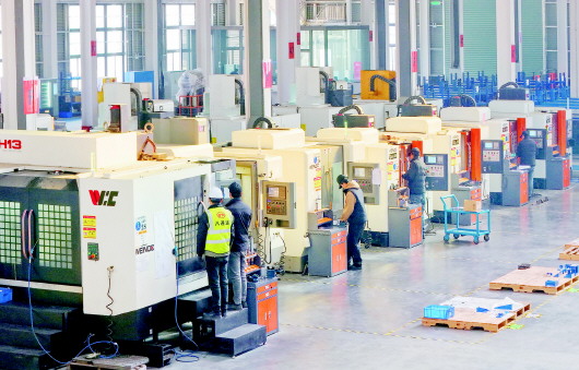 图为近日在六安高新区平桥园境内的安徽八通达智能装备有限公司生产车间,工人们在赶制订单。 赵宇 本报记者 田凯平 摄