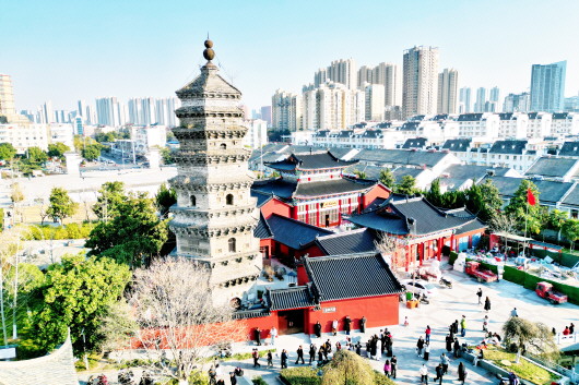 裕安区北塔公园内,砖石古塔倚着红墙古建,身后立着鳞次栉比的现代高楼。如今这里成了网红打卡点:古雅塔身与都市天际线相映,广场上人流熙攘,老地标裹着新潮人气,成为古今相融的热闹角落。