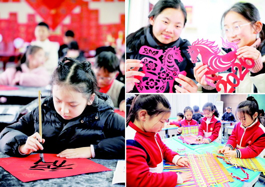 1月23日,金安区人民路小学安丰路校区开展“指尖上的非遗”主题文化活动。师生们一同写春联、写福字(左图),了解并体验编织技艺(右下图),学习剪纸(右上图)与糖画制作等,在实践中感受中华优秀传统文化魅力,寄寓新年美好期许,为即将到来的马年春节增添了浓浓年味。 本报记者 田凯平 通讯员 刘长明 摄