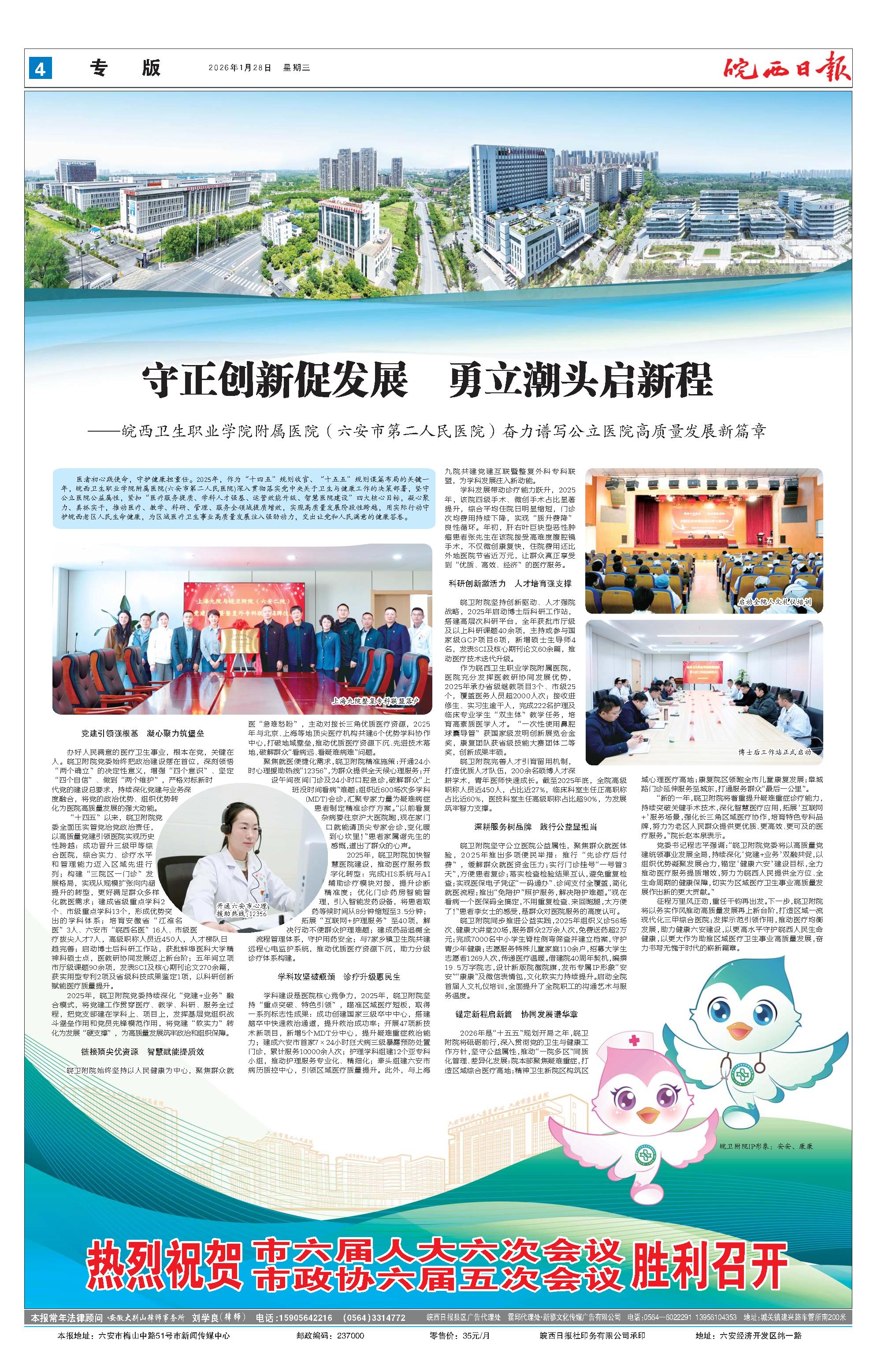 医者初心践使命,守护健康担重任。2025年,作为“十四五”规划收官、“十五五”规划谋篇布局的关键一年,皖西卫生职业学院附属医院(六安市第二人民医院)深入贯彻落实党中央关于卫生与健康工作的决策部署,坚守公立医院公益属性,紧扣“医疗服务提质、学科人才强基、运营效能升级、智慧医院建设”四大核心目标,凝心聚力、真抓实干,推动医疗、教学、科研、管理、服务全领域提质增效,实现高质量发展阶段性跨越,用实际行动守护皖西老区人民生命健康,为区域医疗卫生事业高质量发展注入强劲动力,交出让党和人民满意的健康答卷。 党建引领强根基 凝心聚力筑堡垒 办好人民满意的医疗卫生事业,根本在党,关键在人。皖卫附院党委始终把政治建设摆在首位,深刻领悟“两个确立”的决定性意义,增强“四个意识”、坚定“四个自信”、做到“两个维护”,严格对标新时代党的建设总要求,持续深化党建与业务深度融合,将党的政治优势、组织优势转化为医院高质量发展的强大动能。 “十四五”以来,皖卫附院党委全面压实管党治党政治责任,以高质量党建引领医院实现历史性跨越:成功晋升三级甲等综合医院,综合实力、诊疗水平和管理能力迈入区域先进行列;构建“三院区一门诊”发展格局,实现从规模扩张向内涵提升的转型,更好满足群众多样化就医需求;建成省级重点学科2个、市级重点学科13个,形成优势突出的学科体系;培育安徽省“江淮名医”3人、六安市“皖西名医”16人、市级医疗拔尖人才7人,高级职称人员近450人,人才梯队日趋完善;启动博士后科研工作站,获批蚌埠医科大学精神科硕士点,医教研协同发展迈上新台阶;五年间立项市厅级课题90余项,发表SCI及核心期刊论文270余篇,获实用型专利2项及省级科技成果鉴定1项,以科研创新赋能医疗质量提升。 2025年,皖卫附院党委持续深化“党建+业务”融合模式,将党建工作贯穿医疗、教学、科研、服务全过程,把党支部建在学科上、项目上,发挥基层党组织战斗堡垒作用和党员先锋模范作用,将党建“软实力”转化为发展“硬支撑”,为高质量发展筑牢政治和组织保障。 链接顶尖优资源 智慧赋能提质效 皖卫附院始终坚持以人民健康为中心,聚焦群众就医“急难愁盼”,主动对接长三角优质医疗资源,2025年与北京、上海等地顶尖医疗机构共建6个优势学科协作中心,打破地域壁垒,推动优质医疗资源下沉、先进技术落地,破解群众“看病远、看疑难病难”问题。 聚焦就医便捷化需求,皖卫附院精准施策:开通24小时心理援助热线“12356”,为群众提供全天候心理服务;开设午间夜间门诊及24小时口腔急诊,破解群众“上班没时间看病”难题;组织近600场次多学科(MDT)会诊,汇聚专家力量为疑难病症患者制定精准诊疗方案。“以前看复杂病要往京沪大医院跑,现在家门口就能请顶尖专家会诊,变化暖到心坎里!”患者家属谢先生的感慨,道出了群众的心声。 2025年,皖卫附院加快智慧医院建设,推动医疗服务数字化转型:完成HIS系统与AI辅助诊疗模块对接,提升诊断精准度;优化门诊药房智能管理,引入智能发药设备,将患者取药等候时间从8分钟缩短至3.5分钟;拓展“互联网+护理服务”至40项,解决行动不便群众护理难题;建成药品追溯全流程管理体系,守护用药安全;与7家乡镇卫生院共建远程心电监护系统,推动优质医疗资源下沉,助力分级诊疗体系构建。 学科攻坚破瓶颈 诊疗升级惠民生 学科建设是医院核心竞争力,2025年,皖卫附院坚持“重点突破、特色引领”,瞄准区域医疗短板,取得一系列标志性成果:成功创建国家三级卒中中心,搭建脑卒中快速救治通道,提升救治成功率;开展47项新技术新项目,新增5个MDT分中心,提升疑难重症救治能力;建成六安市首家7×24小时狂犬病三级暴露预防处置门诊,累计服务10000余人次;护理学科组建12个亚专科小组,推动护理服务专业化、精细化;牵头组建六安市病历质控中心,引领区域医疗质量提升。此外,与上海九院共建党建互联暨整复外科专科联盟,为学科发展注入新动能。 学科发展带动诊疗能力跃升,2025年,该院四级手术、微创手术占比显著提升,综合平均住院日明显缩短,门诊次均费用持续下降,实现“质升费降”良性循环。年初,肝右叶巨块型恶性肿瘤患者张先生在该院接受高难度腹腔镜手术,不仅微创康复快,住院费用还比外地医院节省近万元,让群众真正享受到“优质、高效、经济”的医疗服务。 科研创新激活力 人才培育强支撑 皖卫附院坚持创新驱动、人才强院战略,2025年启动博士后科研工作站,搭建高层次科研平台,全年获批市厅级及以上科研课题40余项,主持或参与国家级GCP项目6项,新增硕士生导师4名,发表SCI及核心期刊论文60余篇,推动医疗技术迭代升级。 作为皖西卫生职业学院附属医院,医院充分发挥医教研协同发展优势,2025年承办省级继教项目3个、市级25个,覆盖医务人员超2000人次;接收进修生、实习生逾千人,完成222名护理及临床专业学生“双主体”教学任务,培育高素质医学人才。“一次性使用鼻腔球囊导管”获国家级发明创新展览会金奖,康复团队获省级技能大赛团体二等奖,创新成果丰硕。 皖卫附院完善人才引育留用机制,打造优质人才队伍,200余名硕博人才深耕学术,青年医师快速成长。截至2025年底,全院高级职称人员近450人,占比近27%,临床科室主任正高职