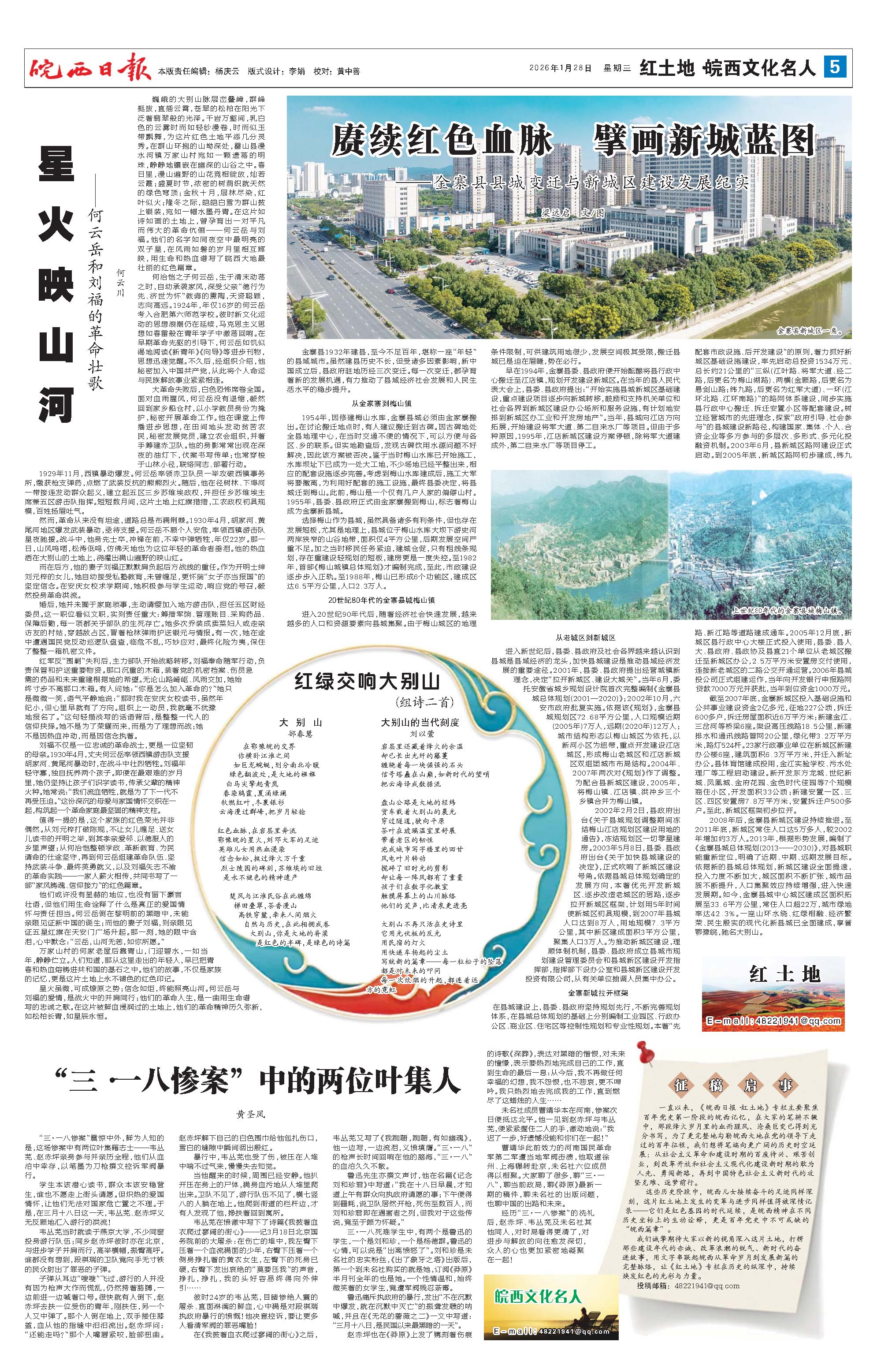 一直以来,《皖西日报·红土地》专栏主要聚焦百年党史第一阶段的皖西记忆,在大家的笔耕不辍中,那段烽火岁月里的血雨腥风、沧桑巨变已得到充分书写,为了更完整地勾勒皖西大地在党的领导下走过的百年征程,我们想将笔端向更广阔的历史时空延展:从社会主义革命和建设时期的百废待兴、艰苦创业,到改革开放和社会主义现代化建设新时期的敢为人先、勇闯新路,再到中国特色社会主义新时代的攻坚克难、逐梦前行。 这些历史阶段中,皖西儿女接续奋斗的足迹同样深刻,这片红土地上发生的变革与进步同样值得被深情记录——它们是红色基因的时代延续,是皖西精神在不同历史坐标上的生动诠释,更是百年党史中不可或缺的“皖西篇章”。 我们诚挚期待大家以新的视角深入这片土地,打捞那些建设年代的赤诚、改革浪潮的锐气、新时代的奋进故事,用文字串联起皖西从革命岁月到发展新篇的完整脉络,让《红土地》专栏在历史的纵深中,持续焕发红色的光彩与力量。 投稿邮箱:48221941@qq.com