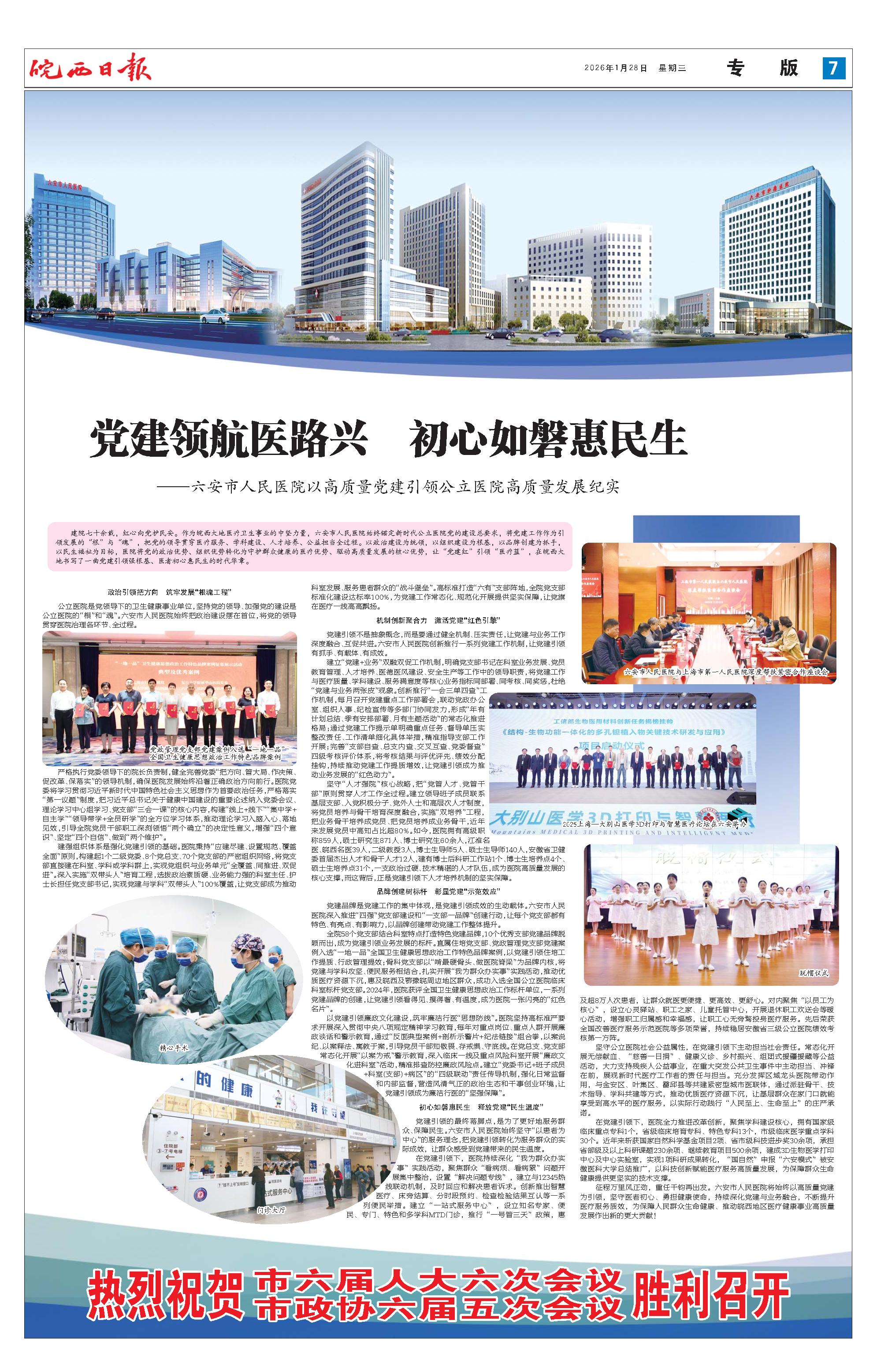 政治引领把方向 筑牢发展“根魂工程” 公立医院是党领导下的卫生健康事业单位,坚持党的领导、加强党的建设是公立医院的“根”和“魂”。六安市人民医院始终把政治建设摆在首位,将党的领导贯穿医院治理各环节、全过程。 严格执行党委领导下的院长负责制,健全完善党委“把方向、管大局、作决策、促改革、保落实”的领导机制,确保医院发展始终沿着正确政治方向前行。医院党委将学习贯彻习近平新时代中国特色社会主义思想作为首要政治任务,严格落实“第一议题”制度,把习近平总书记关于健康中国建设的重要论述纳入党委会议、理论学习中心组学习、党支部“三会一课”的核心内容,构建“线上+线下”“集中学+自主学”“领导带学+全员研学”的全方位学习体系,推动理论学习入脑入心、落地见效,引导全院党员干部职工深刻领悟“两个确立”的决定性意义,增强“四个意识”、坚定“四个自信”、做到“两个维护”。 建强组织体系是强化党建引领的基础。医院秉持“应建尽建、设置规范、覆盖全面”原则,构建起1个二级党委、8个党总支、70个党支部的严密组织网络,将党支部直接建在科室、学科或学科群上,实现党组织与业务单元“全覆盖、同推进、双促进”。深入实施“双带头人”培育工程,选拔政治素质硬、业务能力强的科室主任、护士长担任党支部书记,实现党建与学科“双带头人”100%覆盖,让党支部成为推动科室发展、服务患者群众的“战斗堡垒”。高标准打造“六有”支部阵地,全院党支部标准化建设达标率100%,为党建工作常态化、规范化开展提供坚实保障,让党旗在医疗一线高高飘扬。 机制创新聚合力 激活党建“红色引擎” 党建引领不是抽象概念,而是要通过健全机制、压实责任,让党建与业务工作深度融合、互促共进。六安市人民医院创新推行一系列党建工作机制,让党建引领有抓手、有载体、有成效。 建立“党建+业务”双融双促工作机制,明确党支部书记在科室业务发展、党员教育管理、人才培养、医德医风建设、安全生产等工作中的领导职责,将党建工作与医疗质量、学科建设、服务满意度等核心业务指标同部署、同考核、同奖惩,杜绝“党建与业务两张皮”现象。创新推行“一会三单四查”工作机制,每月召开党建重点工作部署会,联动党政办公室、组织人事、纪检宣传等多部门协同发力,形成“年有计划总结、季有安排部署、月有主题活动”的常态化推进格局;通过党建工作提示单明确重点任务、督导单压实整改责任、工作清单细化具体举措,精准指导支部工作开展;完善“支部自查、总支内查、交叉互查、党委督查”四级考核评价体系,将考核结果与评优评先、绩效分配挂钩,持续推动党建工作提质增效,让党建引领成为推动业务发展的“红色动力”。 坚守“人才强院”核心战略,把“党管人才、党管干部”原则贯穿人才工作全过程。建立领导班子成员联系基层支部、入党积极分子、党外人士和高层次人才制度,将党员培养与骨干培育深度融合,实施“双培养”工程,把业务骨干培养成党员、把党员培养成业务骨干,近年来发展党员中高知占比超80%。如今,医院拥有高级职称859人,硕士研究生871人、博士研究生60余人,江淮名医、皖西名医39人,二级教授3人,博士生导师5人、硕士生导师140人,安徽省卫健委首届杰出人才和骨干人才12人,建有博士后科研工作站1个、博士生培养点4个、硕士生培养点31个,一支政治过硬、技术精湛的人才队伍,成为医院高质量发展的核心支撑,而这背后,正是党建引领下人才培养机制的坚实保障。 品牌创建树标杆 彰显党建“示范效应” 党建品牌是党建工作的集中体现,是党建引领成效的生动载体。六安市人民医院深入推进“四强”党支部建设和“一支部一品牌”创建行动,让每个党支部都有特色、有亮点、有影响力,以品牌创建带动党建工作整体提升。 全院58个党支部结合科室特点打造特色党建品牌,10个优秀支部党建品牌脱颖而出,成为党建引领业务发展的标杆。直属住培党支部、党政管理党支部党建案例入选“一地一品”全国卫生健康思想政治工作特色品牌案例,以党建引领住培工作提质、行政管理提效;骨科党支部以“啃最硬骨头、做医院脊梁”为品牌内核,将党建与学科攻坚、便民服务相结合,扎实开展“我为群众办实事”实践活动,推动优质医疗资源下沉,惠及皖西及鄂豫皖周边地区群众,成功入选全国公立医院临床科室标杆党支部。2024年,医院获评全国卫生健康思想政治工作标杆单位,一系列党建品牌的创建,让党建引领看得见、摸得着、有温度,成为医院一张闪亮的“红色名片”。 以党建引领廉政文化建设,筑牢廉洁行医“思想防线”。医院坚持高标准严要求开展深入贯彻中央八项规定精神学习教育,每年对重点岗位、重点人群开展廉政谈话和警示教育,通过“反面典型案例+剖析示警片+纪法链接”组合拳,以案说纪、以案释法、寓教于案,引导党员干部知敬畏、存戒惧、守底线。在党总支、党支部常态化开展“以案为戒”警示教育,深入临床一线及重点风险科室开展“廉政文化进科室”活动,精准排查防控廉政风险点。建立“党委书记+班子成员+科室(支部)+病区”的“四级联动”责任传导机制,强化日常监督和内部监督,营造风清气正的政治生态和干事创业