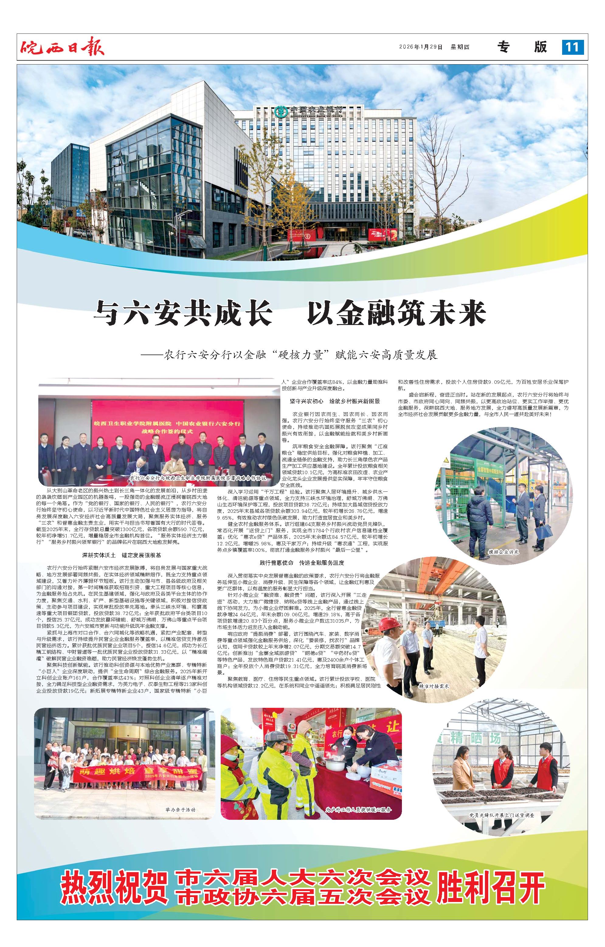 从大别山革命老区的振兴热土到长三角一体化的发展前沿,从乡村田垄的袅袅炊烟到产业园区的机器轰鸣,一股强劲的金融暖流正浸润着皖西大地的每一个角落。作为“党的银行、国家的银行、人民的银行”,农行六安分行始终坚守初心使命,以习近平新时代中国特色社会主义思想为指导,将自身发展深度融入六安经济社会高质量发展大局,聚焦服务实体经济、服务“三农”和普惠金融主责主业,用实干与担当书写着国有大行的时代答卷。截至2025年末,全行存贷款总量突破1300亿元,各项贷款余额590.7亿元,较年初净增51.7亿元,增量稳居全市金融机构首位。“服务实体经济主力银行”“服务乡村振兴领军银行”的品牌名片在皖西大地愈发鲜亮。 深耕实体沃土 锚定发展强根基 农行六安分行始终紧跟六安市经济发展脉搏,将自身发展与国家重大战略、地方发展部署同频共振,在实体经济领域精耕细作,既全力支持重点领域建设,又着力补齐薄弱环节短板。该行主动加强与市、县各级政府及相关部门的沟通对接,第一时间精准获取招商引资、重大工程项目等核心信息,为金融服务抢占先机。在民生基建领域,强化与政府及各类平台主体的协作力度,聚焦交通、水利、矿产、新型基础设施等关键领域,积极对接信贷政策、主动参与项目建设,实现审批投放率先落地。牵头三峡水环境、和襄高速等重大项目银团贷款,投放贷款38.72亿元;全年获批政府平台类项目10个,授信25.37亿元,成功发放霍邱储能、舒城万佛湖、万佛山等重点平台项目贷款5.3亿元,为六安城市更新与功能升级筑牢金融支撑。 紧抓与上海市对口合作、合六同城化等战略机遇,紧扣产业配套、转型与升级需求,该行持续提升民营企业金融服务覆盖率,以精准信贷支持激活民营经济活力。累计获批优质民营企业项目5个,授信14.6亿元,成功为长江精工钢结构、中财管道等一批优质民营企业投放贷款31.33亿元,以“精准滴灌”破解民营企业融资难题,助力民营经济焕发蓬勃生机。 聚焦科技创新赋能。该行推动科创资源与本地优势产业集群、专精特新“小巨人”企业深度联动,提供“全生命周期”综合金融服务。2025年新开立科创企业账户161户,合作覆盖率达43%;对照科创企业清单逐户精准对接,全力满足科技型企业融资需求,为英力电子、汉泰生物工程等213家科创企业投放贷款19亿元;新拓展专精特新企业43户,国家级专精特新“小巨人”企业合作覆盖率达84%,以金融力量助推科技创新与产业升级深度融合。 坚守兴农初心 绘就乡村振兴新图景 农业银行因农而生、因农而长、因农而强。农行六安分行始终坚守服务“三农”初心使命,持续推动巩固拓展脱贫攻坚成果同乡村振兴有效衔接,以金融赋能绘就和美乡村新画卷。 筑牢粮食安全金融屏障。该行聚焦“江淮粮仓”稳定供给目标,强化对粮食种植、加工、流通全链条的金融支持,助力长三角绿色农产品生产加工供应基地建设。全年累计投放粮食相关领域贷款10.1亿元,为高标准农田改造、农业产业化龙头企业发展提供坚实保障,牢牢守住粮食安全底线。 深入学习运用“千万工程”经验。该行聚焦人居环境提升、城乡供水一体化、清洁能源等重点领域,全力支持三峡水环境治理,舒城万佛湖、万佛山生态环境保护等工程,投放项目贷款38.72亿元;持续加大县域信贷投放力度,2025年末县域各项贷款余额303.94亿元,较年初增长26.76亿元,增速9.65%,有效推动农村绿色低碳发展,助力打造宜居宜业和美乡村。 健全农村金融服务体系。该行组建64支服务乡村振兴流动党员先锋队,常态化开展“送贷上门”服务,实现全市1784个行政村农户信息建档全覆盖;优化“惠农e贷”产品体系,2025年末余额达84.57亿元,较年初增长12.2亿元,增幅25.98%,惠及千家万户;持续升级“惠农通”工程,实现服务点乡镇覆盖率100%,彻底打通金融服务乡村振兴“最后一公里”。 践行普惠使命 传递金融服务温度 深入贯彻落实中央发展普惠金融的政策要求,农行六安分行将金融服务延伸至小微企业、消费升级、民生保障等各个领域,让金融红利惠及更广泛群体,以有温度的服务彰显大行担当。 针对小微企业“融资难、融资贵”问题,该行深入开展“三走进”活动,大力推广微捷贷、纳税e贷等线上金融产品,通过线上线下协同发力,为小微企业纾困解难。2025年,全行普惠金融贷款净增24.64亿元,年末余额109.06亿元,增速29.18%,高于各项贷款增速20.83个百分点,服务小微企业户数达31035户,为市场主体活力迸发注入金融动能。 响应政府“提振消费”部署,该行围绕汽车、家装、数字消费等重点领域强化金融服务供给,深化“要装修,找农行”品牌认知,信用卡贷款较上年末净增2.07亿元,分期交易额突破14.7亿元;创新推出“金寨全域旅游贷”“朗德e贷”“中药材e贷”等特色产品,发放特色商户贷款21.41亿元,惠及2400余户个体工商户;全年投放个人消费贷款19.31亿元,全力培育皖美消费新场景。 聚焦教育、医疗、住房等民生重点领域。该行累计投放学校、医院等机构领域贷款12.2亿元,在系统和同业中遥遥领先;积极满足居民刚性和改善性住房需求,投放个人住房贷款9.09亿元,为百姓安居乐业保驾护航。 盛会启新程,奋进正当时。站在新的发展起点,农行六安分行将始终与市委、市政府同心同向、同频共振,以更高政治站位、更实工作举措