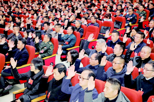 1月31日,人大代表举手表决通过大会各项决议。 本报记者 岳阳阳 田凯平 摄