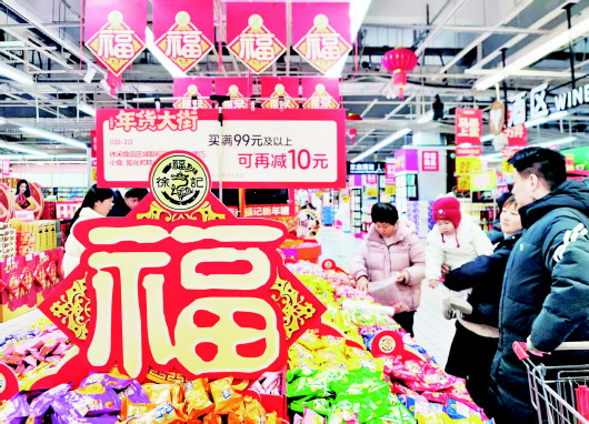 1月31日,市民在六安城区一家大型商超的年货大街上选购糖果、新春饰品等。春节临近,我市相关部门加强产销衔接,持续加大生活必需品保供力度,各类商超、市场货源充足、品种丰富、价格稳定、购销两旺,节日气氛浓厚。