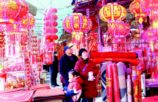 2月8日,在舒城县一处集市,市民在选购春节饰品。