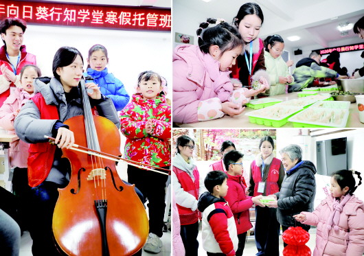 2月10日,在金安区望城街道正阳社区“向日葵行知学堂”,来自合肥师范学院音乐学院的大学生刘一鸣和小朋友一起拉琴唱儿歌(左图)。 寒假期间,金安区望城街道正阳社区以“‘托’起冬日暖阳 共‘管’缤纷寒假”为主题,携手合肥师范学院返乡大学生志愿者开展“向日葵行知学堂”寒假公益托管班,免费为辖区居民及新就业形态劳动者子女提供作业辅导、音乐绘画、书法阅读、手工制作等志愿服务,带领他们参与敬老公益活动,让青少年儿童在托管中锻炼能力、拓展视野、增长知识,既解决了辖区新就业形态劳动者子女假期“看护难”,又让大家在轻松愉快的氛围中度过一个丰富多彩的寒假。 右上图:大学生志愿者在教小朋友包饺子,提升小朋友的动手动脑能力。 右下图:大学生志愿者带领小朋友一起参与敬老爱老公益活动。 本报记者 田凯平 摄