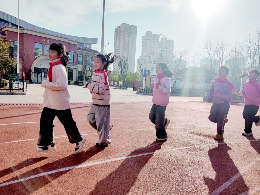 课后服务个性化课上,“红领巾”们沐浴阳光在跑道上欢快奔跑。