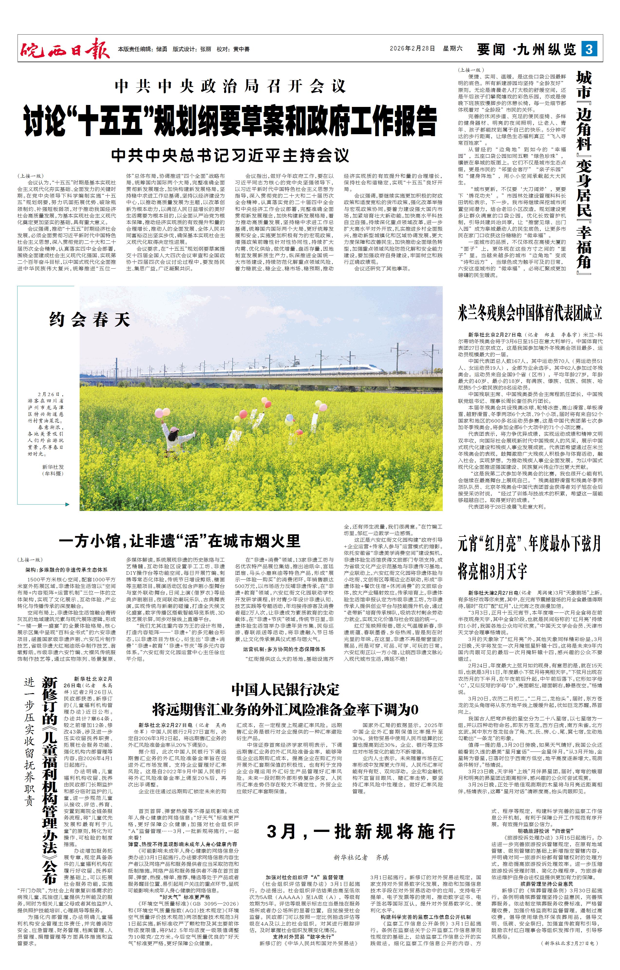 新华社北京2月27日电 中共中央政治局2月27日召开会议,讨论国务院拟提请第十四届全国人民代表大会第四次会议审查的中华人民共和国国民经济和社会发展第十五个五年规划纲要草案稿和审议的《政府工作报告》稿。中共中央总书记习近平主持会议。 会议指出,“十四五”时期我国发展历程极不寻常、极不平凡。面对错综复杂的国际形势和艰巨繁重的国内改革发展稳定任务,以习近平同志为核心的党中央团结带领全党全国各族人民迎难而上、砥砺前行,经受住世纪疫情严重冲击,有效应对一系列重大风险挑战,推动党和国家事业取得新的重大成就。经过5年持续奋斗,“十四五”规划主要目标任务胜利完成,我国经济实力、科技实力、综合国力跃上新台阶,中国式现代化迈出新的坚实步伐,第二个百年奋斗目标新征程实现良好开局。 (下转三版) (上接一版) 会议认为,“十五五”时期是基本实现社会主义现代化夯实基础、全面发力的关键时期。在党中央领导下科学编制实施“十五五”规划纲要,努力巩固拓展优势、破除瓶颈制约、补强短板弱项,对于推动我国经济社会高质量发展,为基本实现社会主义现代化奠定更加坚实的基础,具有重大意义。 会议强调,推动“十五五”时期经济社会发展,必须全面贯彻习近平新时代中国特色社会主义思想,深入贯彻党的二十大和二十届历次全会精神,认真落实四中全会部署,围绕全面建成社会主义现代化强国、实现第二个百年奋斗目标,以中国式现代化全面推进中华民族伟大复兴,统筹推进“五位一体”总体布局,协调推进“四个全面”战略布局,统筹国内国际两个大局,完整准确全面贯彻新发展理念,加快构建新发展格局,坚持稳中求进工作总基调,坚持以经济建设为中心,以推动高质量发展为主题,以改革创新为根本动力,以满足人民日益增长的美好生活需要为根本目的,以全面从严治党为根本保障,推动经济实现质的有效提升和量的合理增长,推动人的全面发展、全体人民共同富裕迈出坚实步伐,确保基本实现社会主义现代化取得决定性进展。 会议要求,在“十五五”规划纲要草案提交十四届全国人大四次会议审查和全国政协十四届四次会议讨论过程中,要发扬民主、集思广益,广泛凝聚共识。 会议指出,做好今年政府工作,要在以习近平同志为核心的党中央坚强领导下,以习近平新时代中国特色社会主义思想为指导,深入贯彻党的二十大和二十届历次全会精神,认真落实党的二十届四中全会和中央经济工作会议部署,完整准确全面贯彻新发展理念,加快构建新发展格局,着力推动高质量发展,坚持稳中求进工作总基调,统筹国内国际两个大局,更好统筹发展和安全,实施更加积极有为的宏观政策,增强政策前瞻性针对性协同性,持续扩大内需、优化供给,做优增量、盘活存量,因地制宜发展新质生产力,纵深推进全国统一大市场建设,持续防范化解重点领域风险,着力稳就业、稳企业、稳市场、稳预期,推动经济实现质的有效提升和量的合理增长,保持社会和谐稳定,实现“十五五”良好开局。 会议强调,要继续实施更加积极的财政政策和适度宽松的货币政策,强化改革举措与宏观政策协同。要着力建设强大国内市场,加紧培育壮大新动能,加快高水平科技自立自强。持续深化重点领域改革,进一步扩大高水平对外开放,扎实推进乡村全面振兴,推动新型城镇化和区域协调发展。更大力度保障和改善民生,加快推动全面绿色转型,加强重点领域风险防范化解和安全能力建设。要加强政府自身建设,牢固树立和践行正确政绩观。 会议还研究了其他事项。