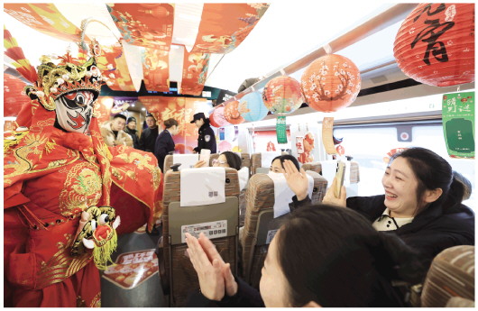 元宵节来临之际,中国铁路哈尔滨局集团有限公司齐齐哈尔客运段担当的齐齐哈尔南开往天津西的G1280次列车上举行“闹元宵·话团圆”主题活动,车厢内张灯结彩,民族歌舞、舞狮、变脸等节目接连上演,让旅途充满节日温情。 新华社发(徐率 摄)