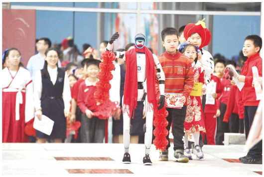 3月2日,在广西南宁市滨湖路小学,人形机器人和孩子们在开学典礼上送上马年祝福。