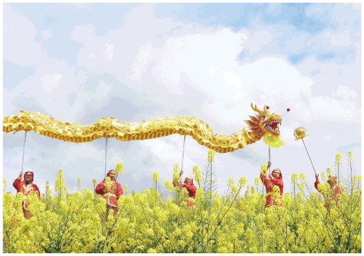 3月2日,人们在四川省达州市达川区龙会乡的油菜花田间表演舞龙。