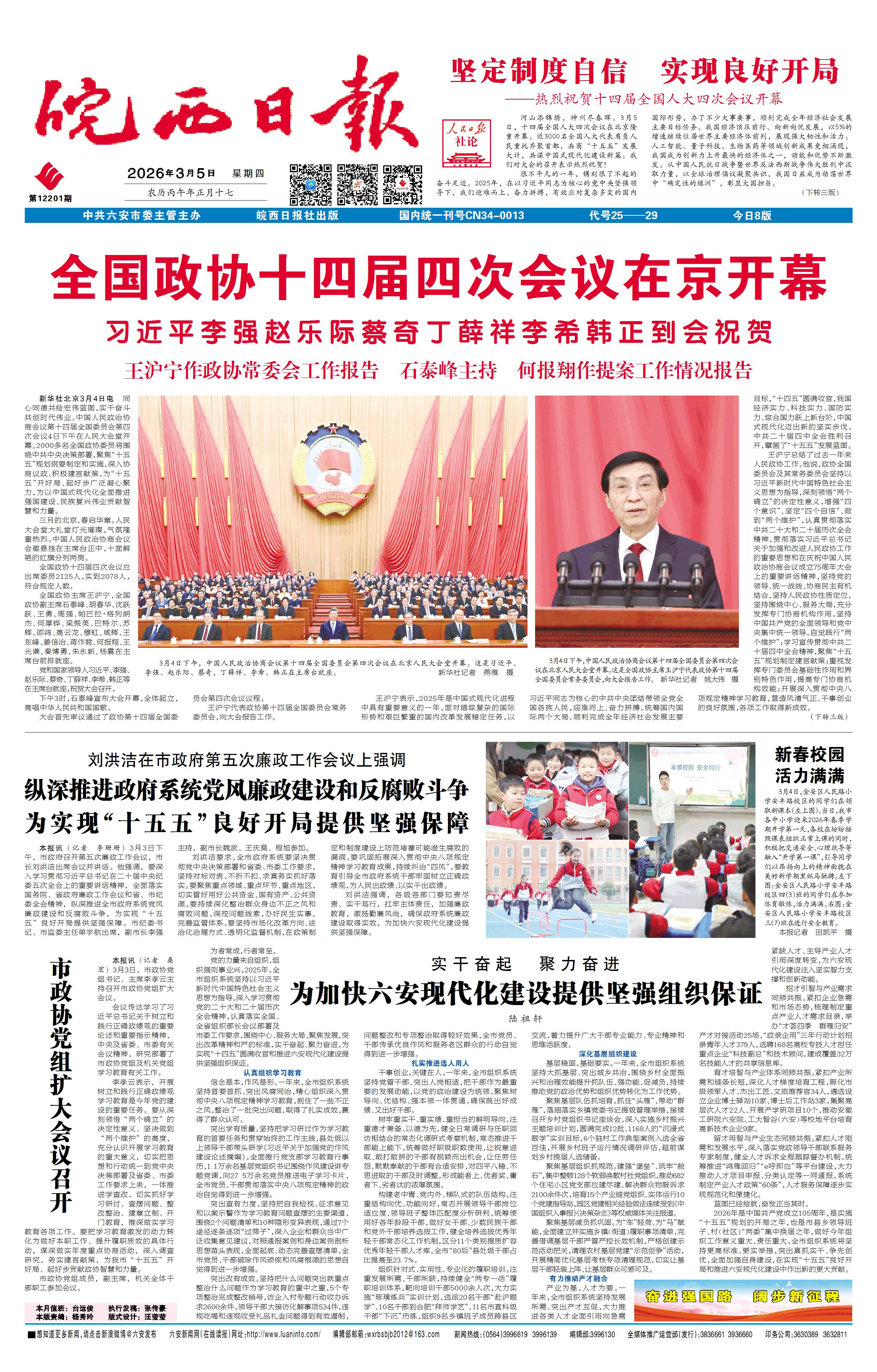 新华社北京3月4日电 同心同德共绘宏伟蓝图,实干奋斗共创时代伟业。中国人民政治协商会议第十四届全国委员会第四次会议4日下午在人民大会堂开幕。2000多名全国政协委员将围绕中共中央决策部署,聚焦“十五五”规划纲要制定和实施,深入协商议政、积极建言献策,为“十五五”开好局、起好步广泛凝心聚力,为以中国式现代化全面推进强国建设、民族复兴伟业贡献智慧和力量。 三月的北京,春启华章。人民大会堂大礼堂灯光璀璨,气氛隆重热烈。中国人民政治协商会议会徽悬挂在主席台正中,十面鲜艳的红旗分列两侧。 全国政协十四届四次会议应出席委员2125人,实到2078人,符合规定人数。 全国政协主席王沪宁,全国政协副主席石泰峰、胡春华、沈跃跃、王勇、周强、帕巴拉·格列朗杰、何厚铧、梁振英、巴特尔、苏辉、邵鸿、高云龙、穆虹、咸辉、王东峰、姜信治、蒋作君、何报翔、王光谦、秦博勇、朱永新、杨震在主席台前排就座。 党和国家领导人习近平、李强、赵乐际、蔡奇、丁薛祥、李希、韩正等在主席台就座,祝贺大会召开。 下午3时,石泰峰宣布大会开幕,全体起立,高唱中华人民共和国国歌。 大会首先审议通过了政协第十四届全国委员会第四次会议议程。 王沪宁代表政协第十四届全国委员会常务委员会,向大会报告工作。 王沪宁表示,2025年是中国式现代化进程中具有重要意义的一年。面对错综复杂的国际形势和艰巨繁重的国内改革发展稳定任务,以习近平同志为核心的中共中央团结带领全党全国各族人民,迎难而上、奋力拼搏,统筹国内国际两个大局,顺利完成全年经济社会发展主要目标,“十四五”圆满收官,我国经济实力、科技实力、国防实力、综合国力跃上新台阶,中国式现代化迈出新的坚实步伐。中共二十届四中全会胜利召开,擘画了“十五五”发展蓝图。 王沪宁总结了过去一年来人民政协工作。他说,政协全国委员会及其常务委员会坚持以习近平新时代中国特色社会主义思想为指导,深刻领悟“两个确立”的决定性意义,增强“四个意识”、坚定“四个自信”、做到“两个维护”,认真贯彻落实中共二十大和二十届历次全会精神,贯彻落实习近平总书记关于加强和改进人民政协工作的重要思想和在庆祝中国人民政治协商会议成立75周年大会上的重要讲话精神,坚持党的领导、统一战线、协商民主有机结合,坚持人民政协性质定位,坚持围绕中心、服务大局,充分发挥专门协商机构作用。坚持中国共产党的全面领导和党中央集中统一领导,自觉践行“两个维护”;学习宣传贯彻中共二十届四中全会精神,聚焦“十五五”规划制定建言献策;重视发挥专门委员会基础性作用和界别特色作用,提高专门协商机构效能;开展深入贯彻中央八项规定精神学习教育,营造风清气正、干事创业的良好氛围,各项工作取得新成效。 (下转三版) (上接一版) 王沪宁表示,2026年是“十五五”开局之年,人民政协要坚持以习近平新时代中国特色社会主义思想为指导,深入贯彻中共二十大和二十届历次全会精神,认真落实中共二十届四中全会部署,贯彻落实习近平总书记关于加强和改进人民政协工作的重要思想,坚持和完善中国共产党领导的多党合作和政治协商制度,坚持人民政协性质定位,坚持团结和民主两大主题,坚持聚焦党和国家中心任务履职尽责,组织参加人民政协的各党派团体和各族各界人士,为实现“十五五”良好开局广泛凝聚人心、凝聚共识、凝聚智慧、凝聚力量。 王沪宁表示,要毫不动摇坚持中国共产党的领导,把牢正确政治方向;坚持把党的创新理论武装融入日常抓在经常,提升思想政治引领、广泛凝聚共识工作实效;围绕“十五五”规划实施议政建言,以高质量履职成果服务党和国家中心任务;充分发挥委员主体作用,提高履职能力和水平,勠力同心、勇毅前行,推动新时代新征程人民政协事业高质量发展,为在中国特色社会主义道路上建设社会主义现代化国家贡献智慧和力量。 全国政协副主席何报翔代表政协第十四届全国委员会常务委员会,向大会报告全国政协十四届三次会议以来的提案工作情况。全国政协十四届三次会议以来,共提出提案5992件,经审查立案5061件,99.9%的提案已经办复。提案围绕全面建成社会主义现代化强国、实现第二个百年奋斗目标的宏伟蓝图,紧扣“五位一体”总体布局和“四个全面”战略布局,建睿智之言、献务实之策,提案所提建议为全面完成“十四五”规划目标任务、研究制定“十五五”规划,促进经济社会高质量发展发挥积极作用。 在主席台就座的领导同志还有:王毅、尹力、刘国中、李干杰、李书磊、李鸿忠、何立峰、张国清、陈文清、陈吉宁、陈敏尔、袁家军、黄坤明、刘金国、王小洪、张升民、王东明、肖捷、郑建邦、丁仲礼、蔡达峰、何维、武维华、铁凝、彭清华、张庆伟、洛桑江村、雪克来提·扎克尔、吴政隆、谌贻琴、张军、应勇等。 中共中央、全国人大常委会、国务院有关部门负责同志应邀列席开幕会。外国驻华使节、海外华侨等应邀参加开幕会。