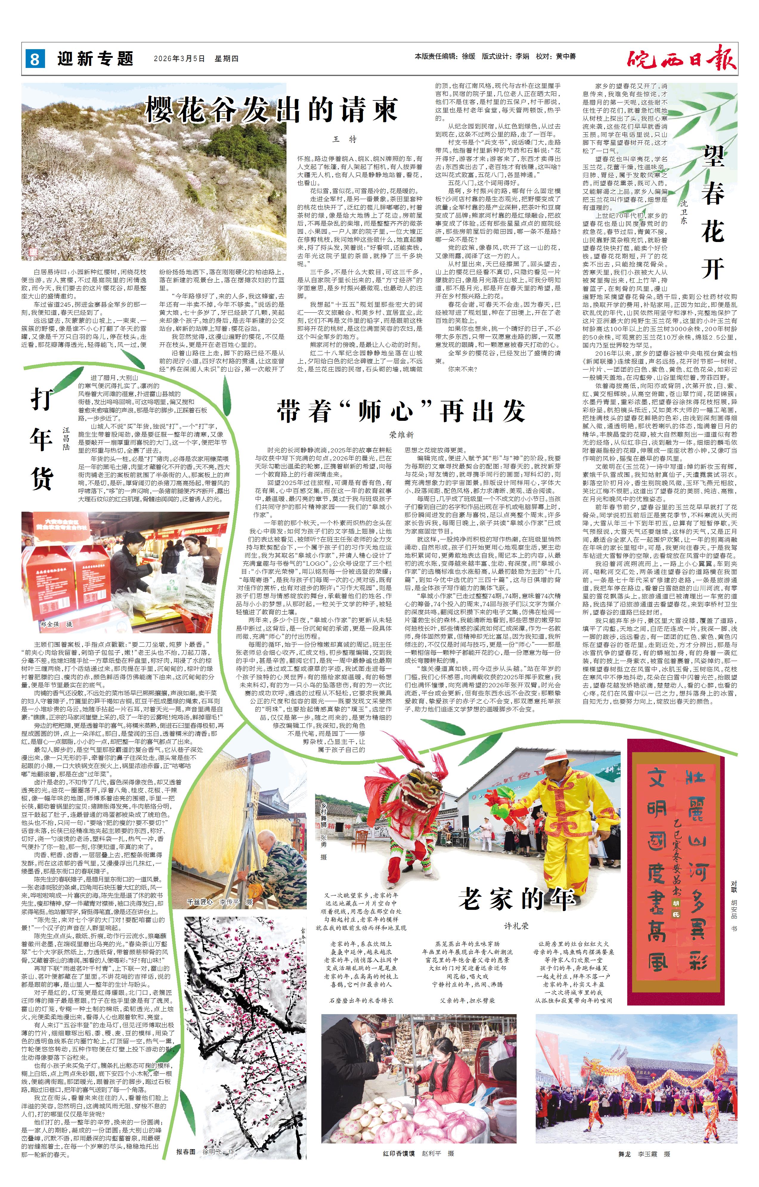 2016年以来,家乡的望春谷被中央电视台黄金档《新闻联播》连续报道,声名远扬。花开时节那一树树、一片片、一团团的白色、紫色、黄色、红色花朵,如彩云一般铺天盖地。在沟壑旁、山谷里绚烂着,芳菲四野。
