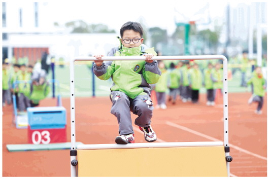 3月5日,嘉兴市实验小学亚欧校区的学生们参加开学第一课跑酷运动训练。