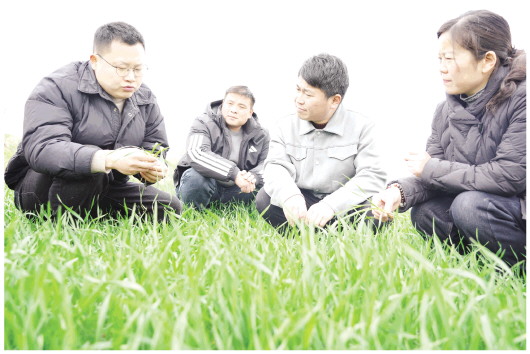 图为裕安区农技推广中心工作人员韩小龙(左一)给种植大户讲解小麦田间管理要点。