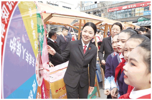 3月5日,裕安区人民法院组织青年法律服务志愿队,走进辖区文庙街开展“法润春风里 护‘她’绽芳华”普法宣传志愿服务活动,将法治关怀送到群众身边,把便民利民举措落到实处,让法治观念深入人心。图为青年法官通过法律知识大转轮游戏向青少年科普法律知识。