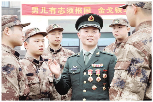 图为三次荣立个人三等功、多次受部队和军校嘉奖的裕安区江家店镇现役军人、解放军陆军步兵学院学员李成锐,在向“准新兵”传经送宝,交流自己从高考失利到军营成长为训练标兵、提干保送上军校的奋斗经历。