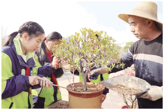 图为同学们在皖西学院植物园园艺老师的指导下体验盆景栽植。