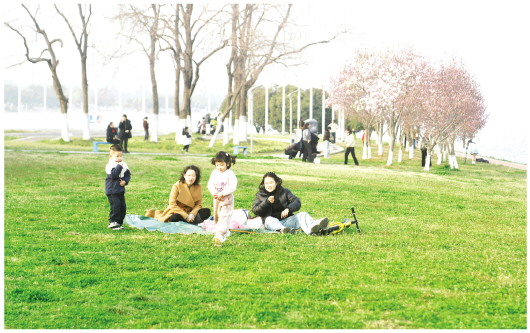 早春时节,六安淠河国家湿地公园月亮岛段碧水环绕,绿草如茵,次第开放的玉兰、李花芳香四溢,吸引许多市民前来踏青游玩,乐享春光。